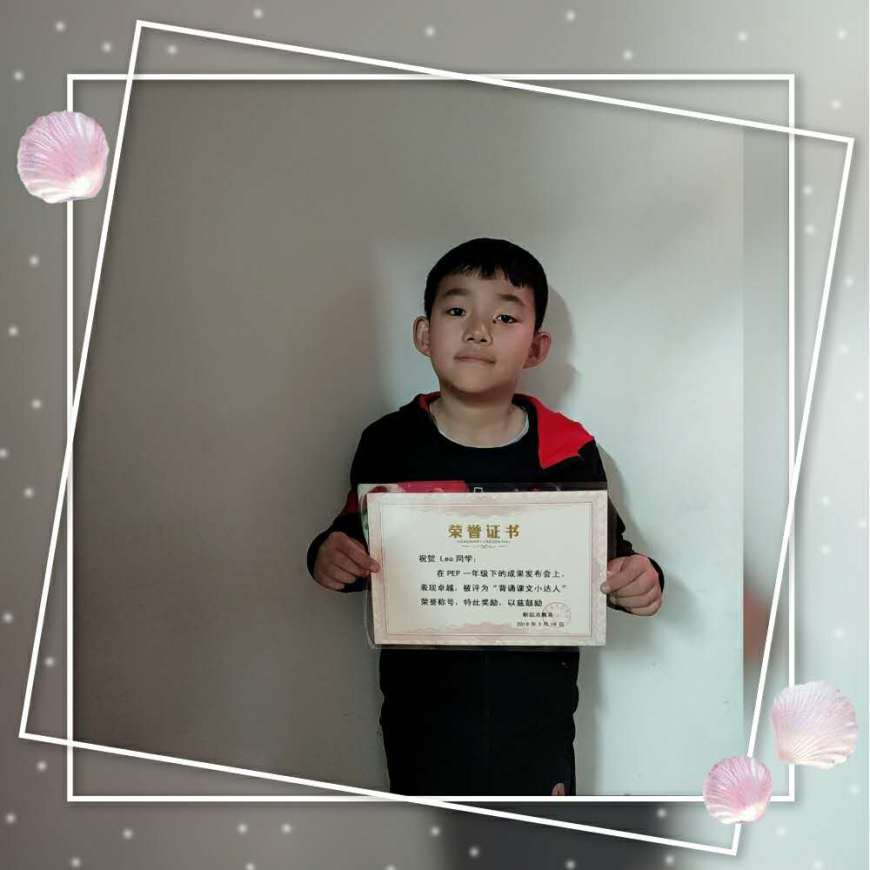 王子涵同学平时学习认真,喜欢阅读,背诵古诗课文也特别在行,曾在班级获得背诵古诗课文小达人称号!