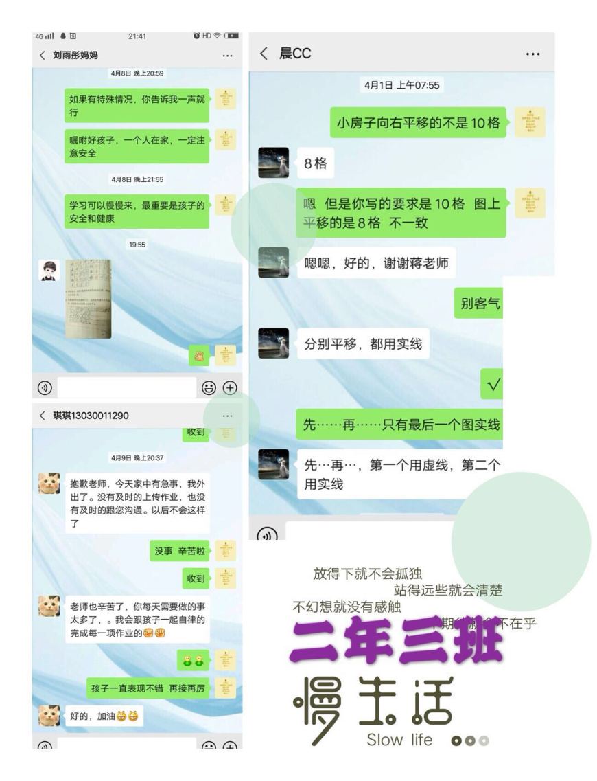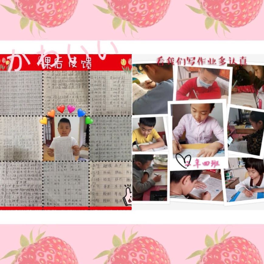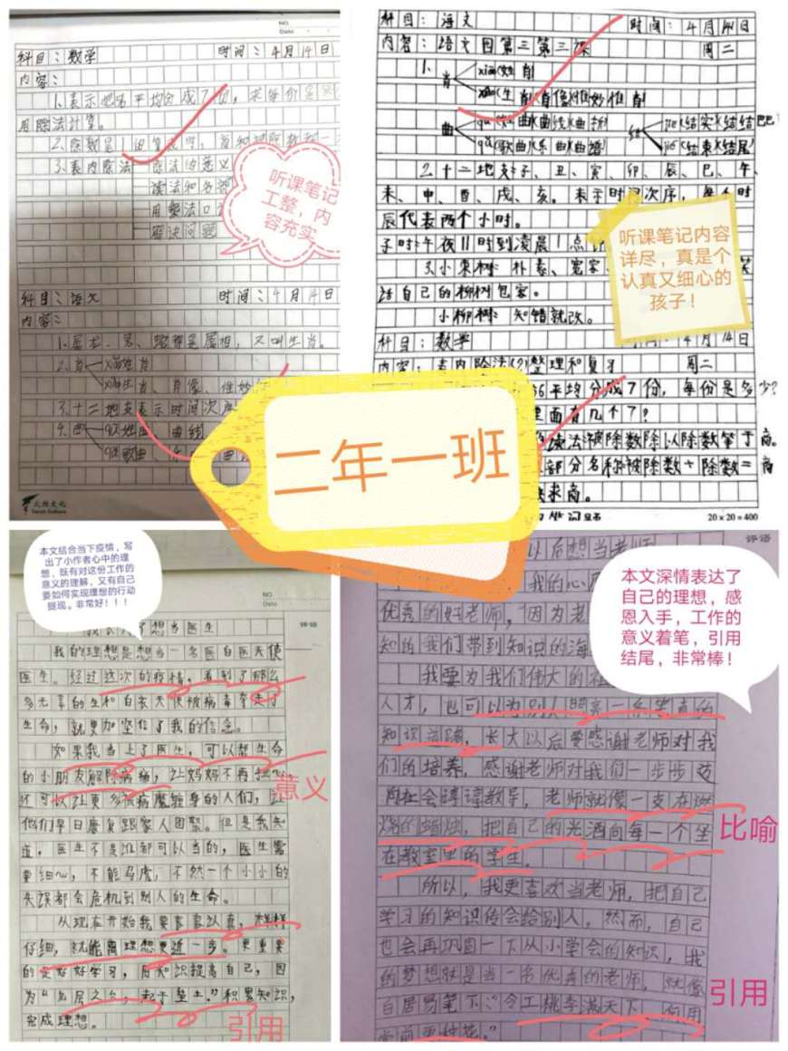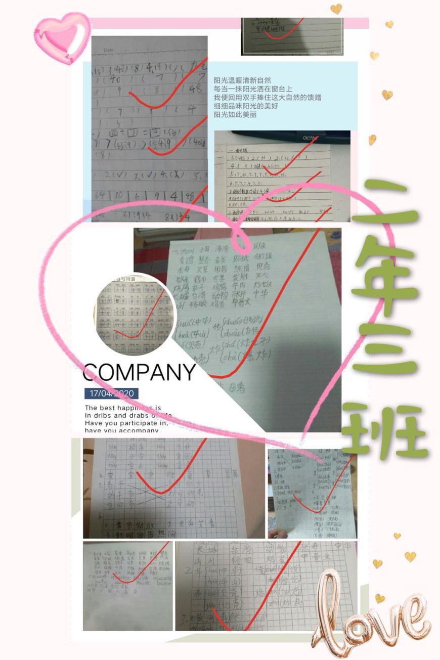 和在线下一样,二年组的老师们不放过一个知识点,不放过一个学生,重点关注学生中的学困生,切实做到线下样样清,保证教学效果。尤其对作业的批改更是精益求精。每天一节的空中课堂必有作业,有作业必有批改,有批改必有更正,有更正必有二次批改,有批改必有统计,有统计必有反馈。那一张张认真书写的作业,一个个批改的符号,一句句点评的背后,是二年组老师们辛勤付出的累积。那些优秀作业,正是二年组老师们敬业精神的体现。