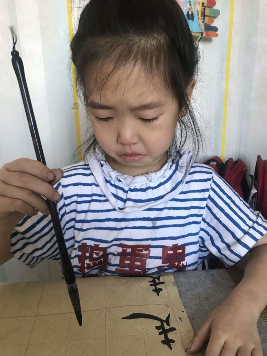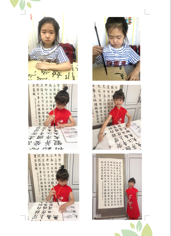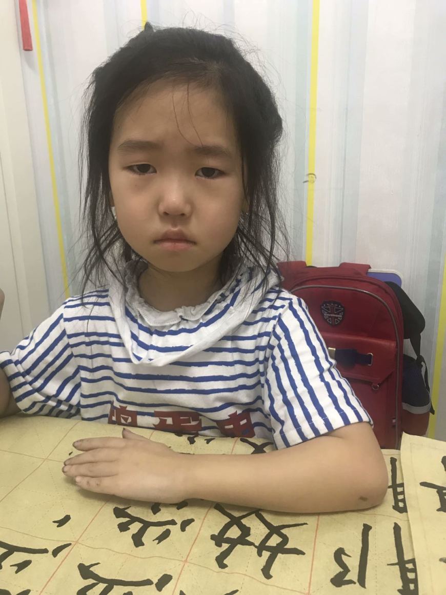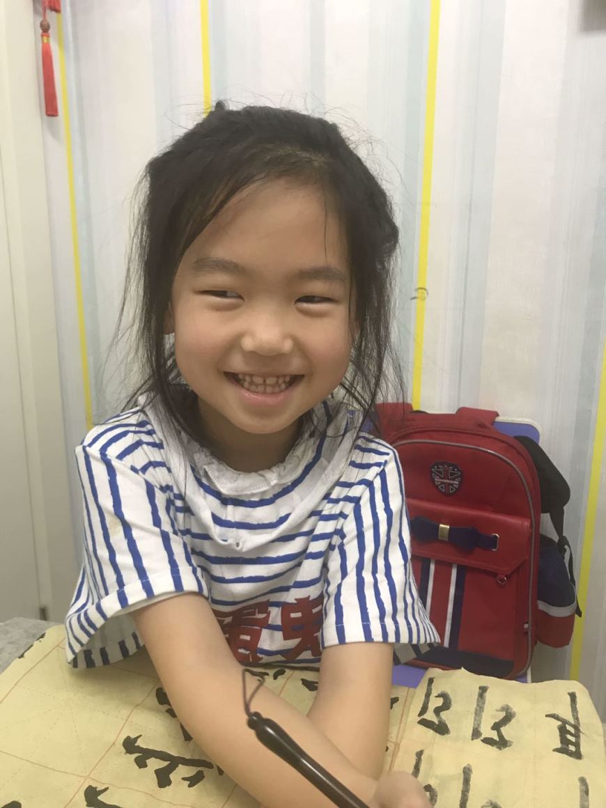 在书法道路上没有捷径可走,只有日复一日的不断重复训练才能体会到那些线条的灵动之美,也让此时仅有6岁的女孩暗下决心要写一手漂亮的书法。尤其在新冠肺炎疫情期间,每日坚持书法训练,在老师的严格要求和悉心指导下对书法的领悟更加深入。在此期间研习了楷书、隶书、篆书、甲骨文等多种文字的书写。临摹柳公权的玄秘塔碑帖、颜真卿的多宝塔碑帖,以及诗词名篇。过春节及其他节假日也丝毫没有影响到训练的热情,每天坚持分时段练习书法8小时左右,在八个月的时间内累计训练时长达1900小时以上。练习用过的报纸不计其数、临摹使用过的宣纸也有几百斤。在此期间完成了三年的书法学习任务,闯过了书法道路上遇到的种种难关,取得了飞跃性的进步。积极影响着和带动着身边的同学学习书法,和对中国悠久历史文化的热爱。路漫漫其修远兮,吾将上下而求索。万里长征只是第一步,前进的道路任重而道远。发扬祖国传统文化继承祖先留下的瑰宝,再接再厉勇攀高峰。