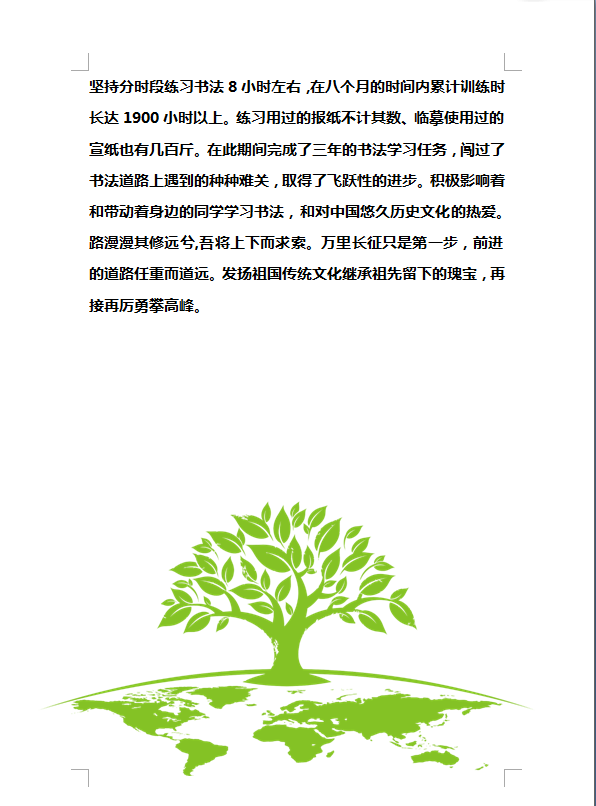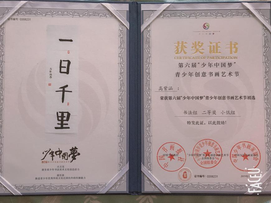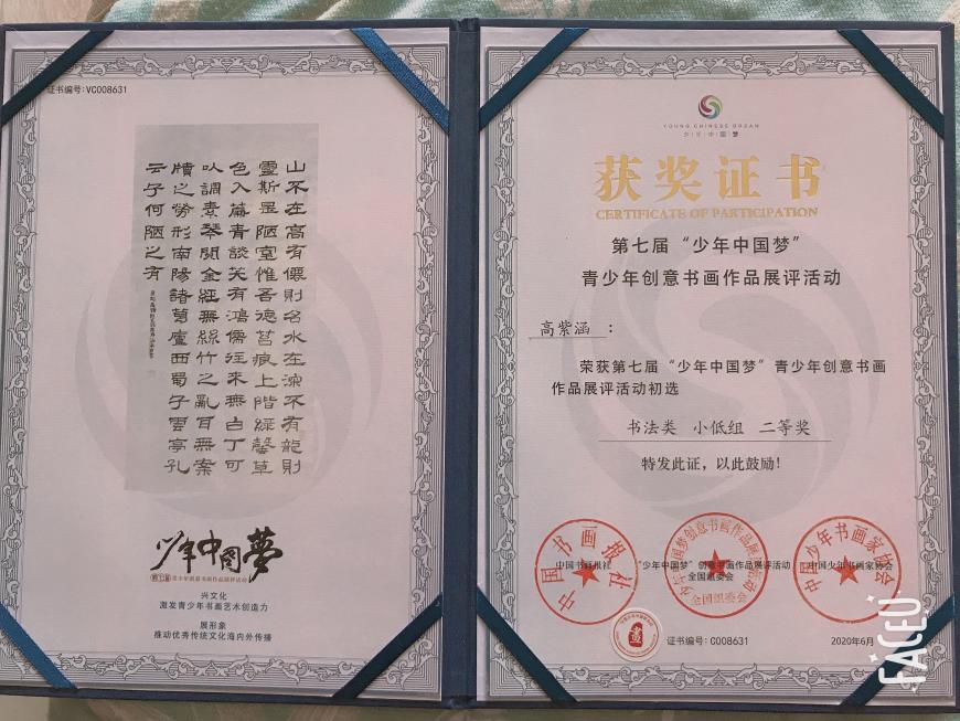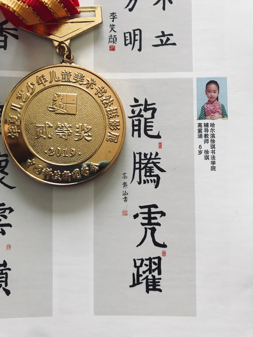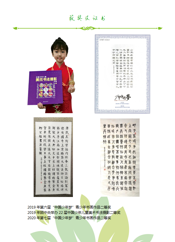 在书法道路上没有捷径可走,只有日复一日的不断重复训练才能体会到那些线条的灵动之美,也让此时仅有6岁的女孩暗下决心要写一手漂亮的书法。尤其在新冠肺炎疫情期间,每日坚持书法训练,在老师的严格要求和悉心指导下对书法的领悟更加深入。在此期间研习了楷书、隶书、篆书、甲骨文等多种文字的书写。临摹柳公权的玄秘塔碑帖、颜真卿的多宝塔碑帖,以及诗词名篇。过春节及其他节假日也丝毫没有影响到训练的热情,每天坚持分时段练习书法8小时左右,在八个月的时间内累计训练时长达1900小时以上。练习用过的报纸不计其数、临摹使用过的宣纸也有几百斤。在此期间完成了三年的书法学习任务,闯过了书法道路上遇到的种种难关,取得了飞跃性的进步。积极影响着和带动着身边的同学学习书法,和对中国悠久历史文化的热爱。路漫漫其修远兮,吾将上下而求索。万里长征只是第一步,前进的道路任重而道远。发扬祖国传统文化继承祖先留下的瑰宝,再接再厉勇攀高峰。