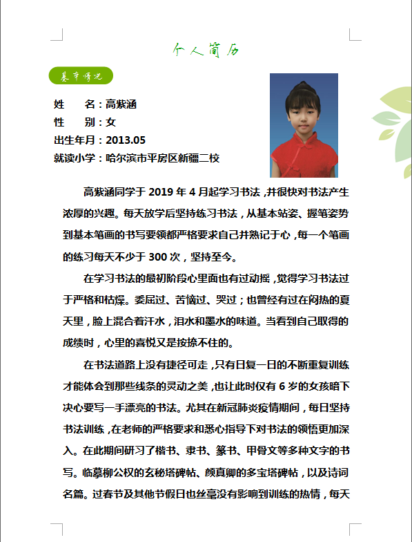 高紫涵同学于2019年4月起学习书法,并很快对书法产生浓厚的兴趣。每天放学后坚持练习书法,从基本站姿、握笔姿势到基本笔画的书写要领都严格要求自己并熟记于心,每一个笔画的练习每天不少于300次,坚持至今。