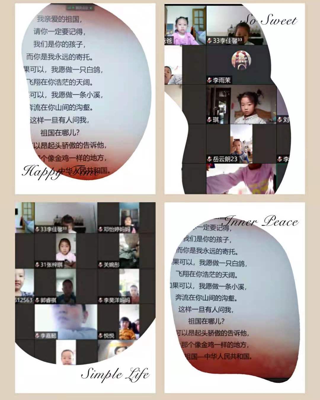 新疆二校一年二班举行了一次特殊的线上爱国诗歌朗诵小比赛。参赛的每一位同学用真挚的情感,以诗词配乐、激情朗诵等形式,或慷慨激昂,或深情款款,或浅吟低唱,精彩演绎了许多脍炙人口的诗文。厚重深沉的《我爱你中国》,表现出对祖国母亲崇高的敬意与真挚的爱慕,也激发了同学们对祖国强烈的爱和深深的情。