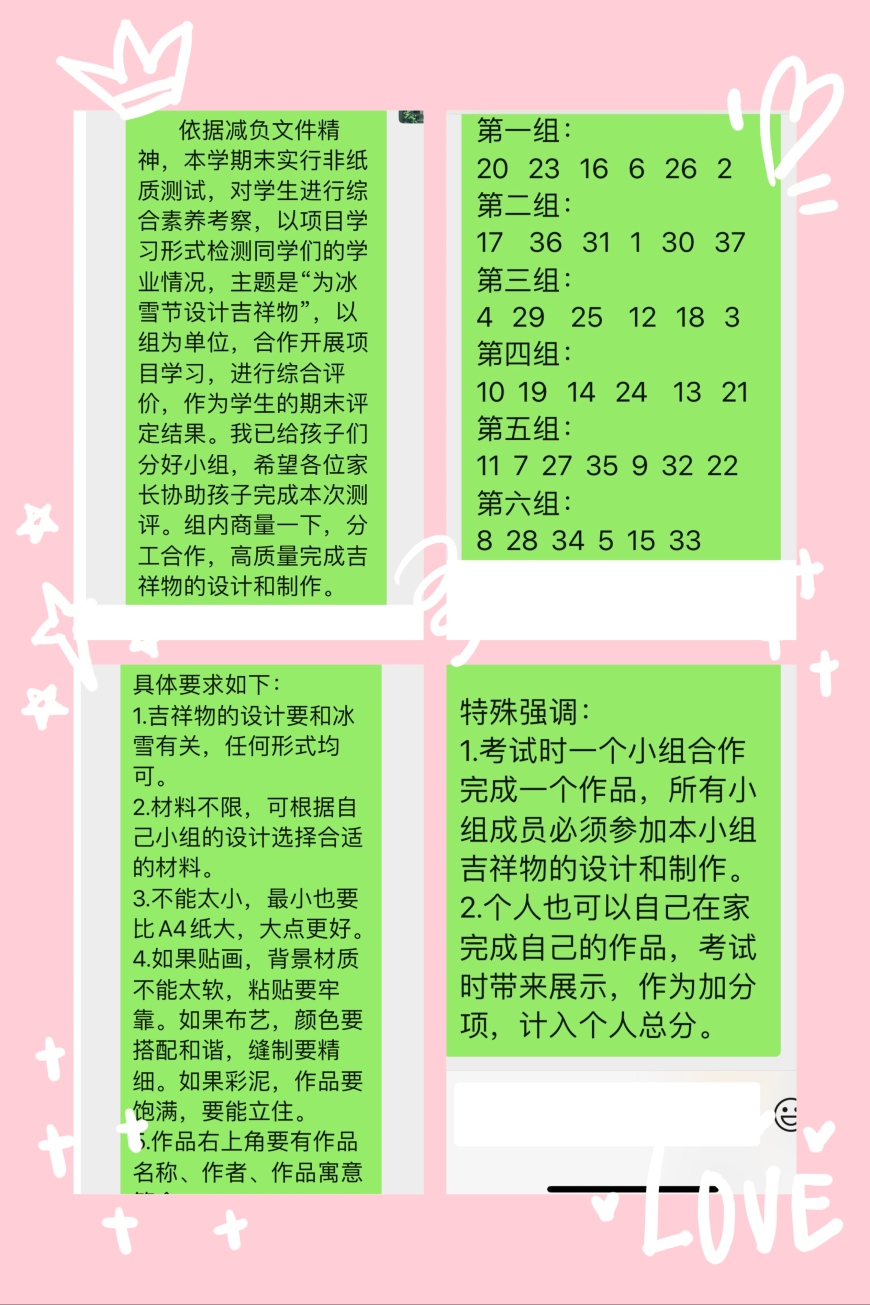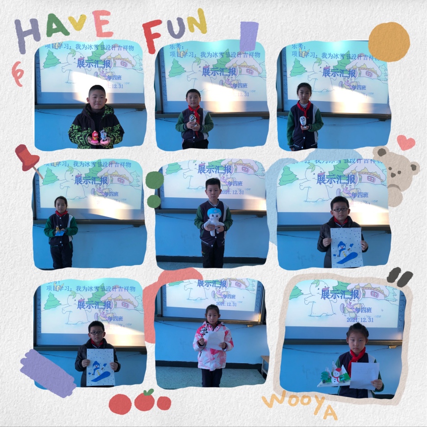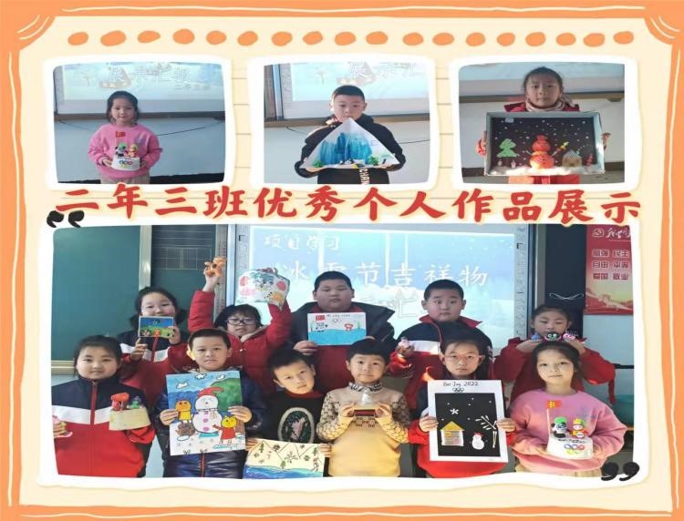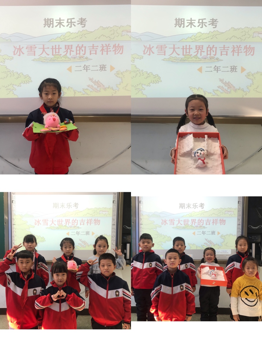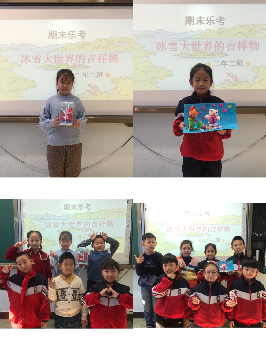二年三班认真落实双减政策, 在期末测评中不仅关注学生知识能力水平掌握情况,还关注学生学习态度养成、生活能力等可持续发展能力。为了发现和发展学生多方面的潜能,帮助学生认识自我,建立自信,发展评价的教育功能,用评价来促进学生的全面发展,期末非纸笔考试,班级了开展了“项目式测评”的方式-----制作冰雪节吉祥物。融合数学、语文、科学、美术、体育、道法等多学科内容,使学生置身于真实情境任务的挑战中,一方面考查了学生基础知识、基本技能、问题解决能力,一方面考查沟通合作能力和批判性思维等方面的水平。