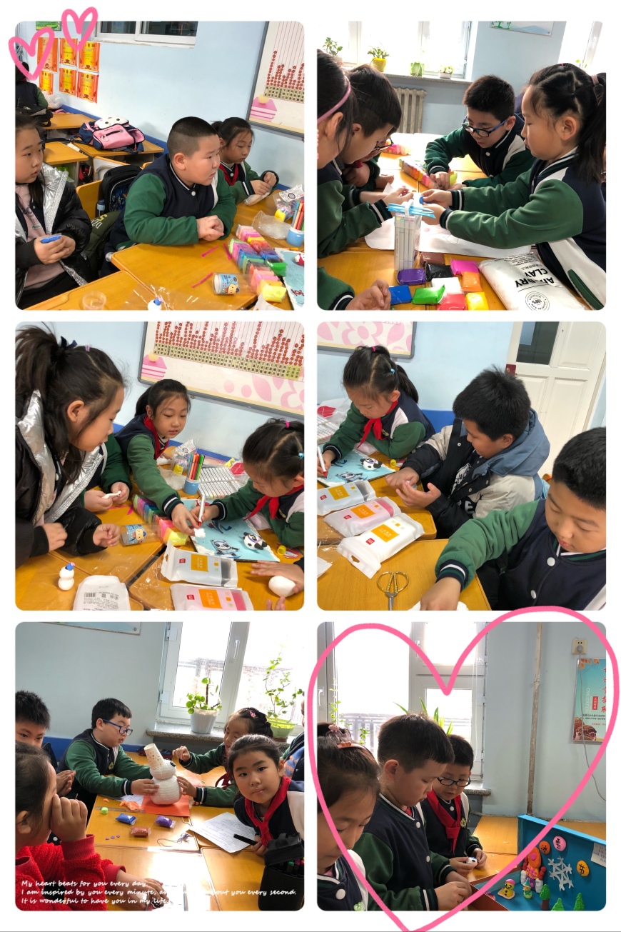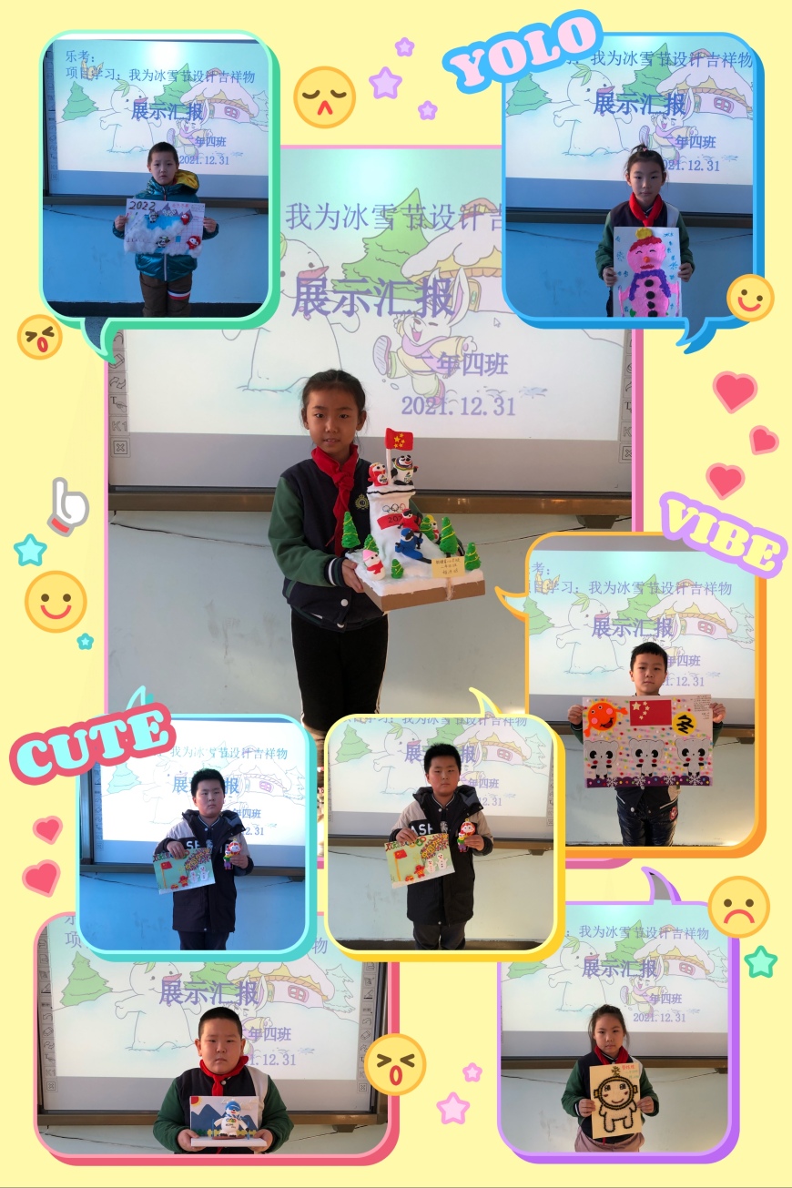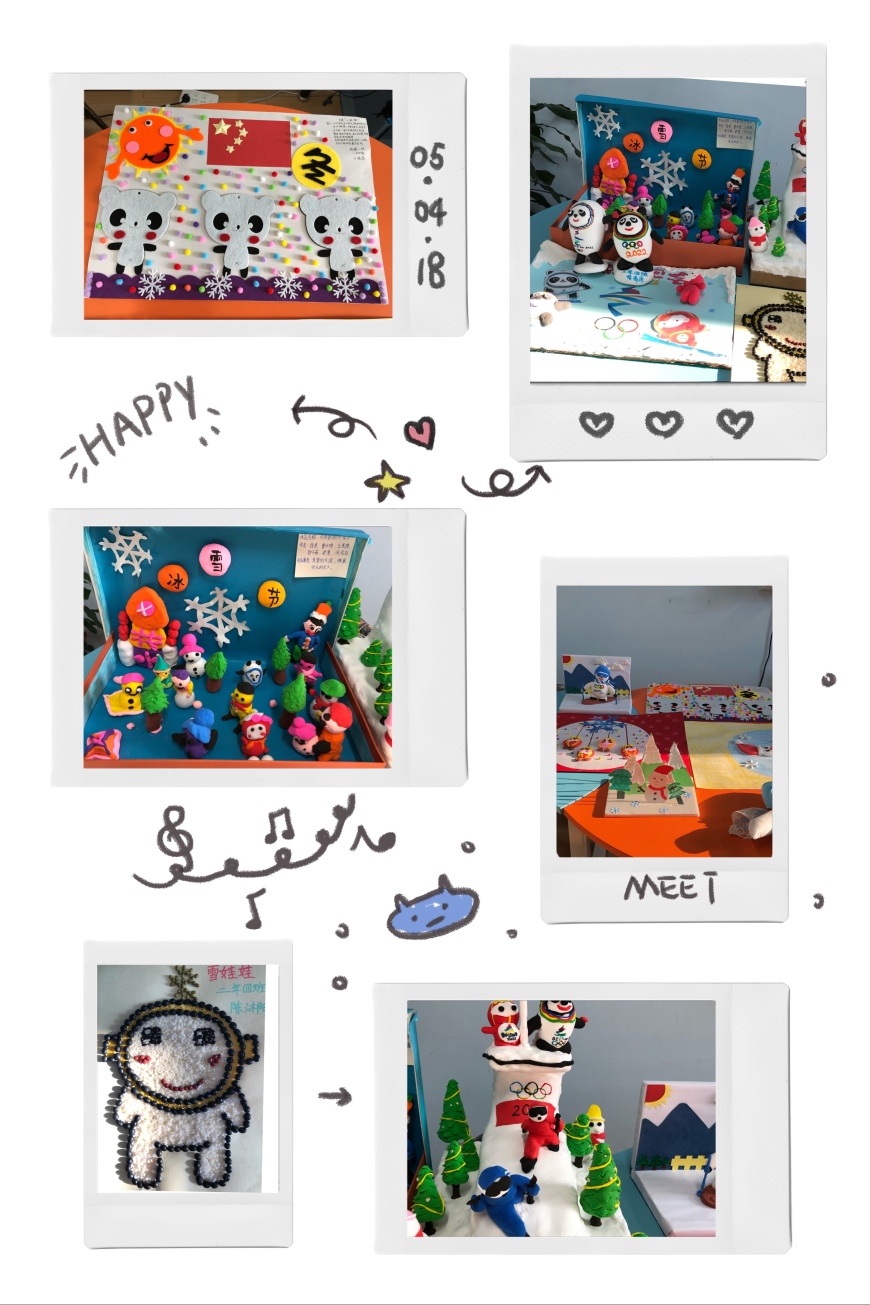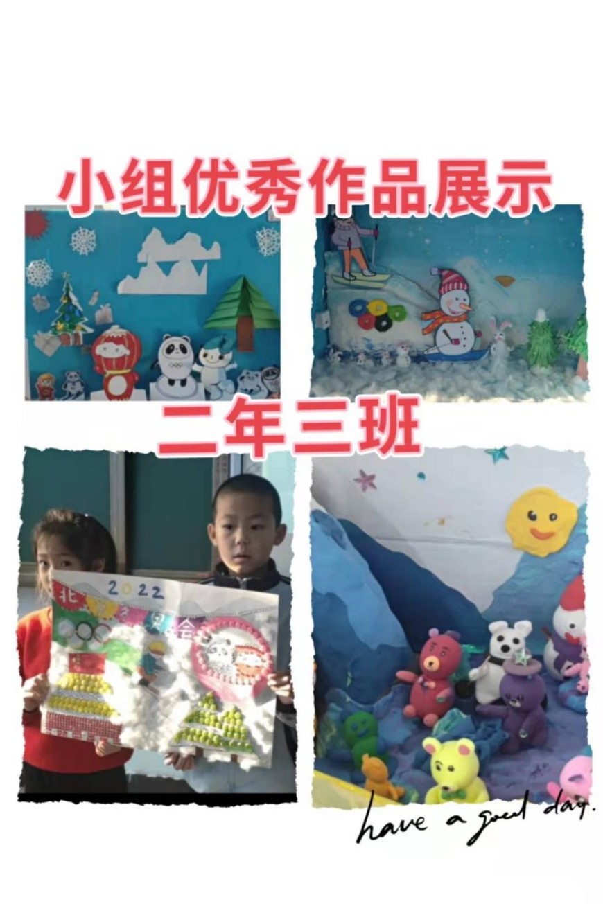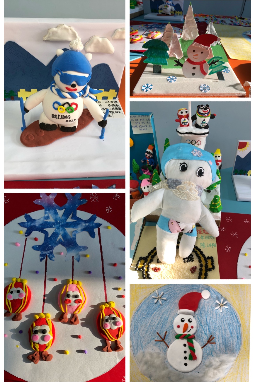 各小组的作品主要采用了彩纸、彩泥、纸板、棉花、纽扣、水彩笔、乳白胶、彩灯、小贴纸等材料,融合了北京冬奥会、哈尔滨冰雪节,冰雪文化等相关元素,体现了勇敢,团结、健康、坚强、活泼、友谊的理念。除了小组作品,还有个人创作作品也进行了展示。最后评出第一小组、第四小组、第五小组的作品为优秀。个人作品后的优秀的同学是:黄美嘉、刘茜蓓、王骏怡和王启恒同学。
