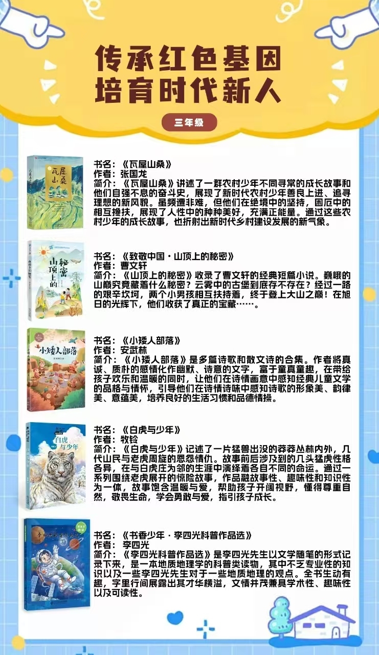 暑假期间,三年级老师结合不同学生的年龄特点以及阅读能力,向同学们推荐了暑期阅读书目及阅读要求。同学们可以根据自己的假期时间和精力,合理安排阅读时间和阅读书目,也可以选择自己感兴趣的书目进行阅读。旨在引导学生养成“爱读书、读好书、善读书”的良好习惯。