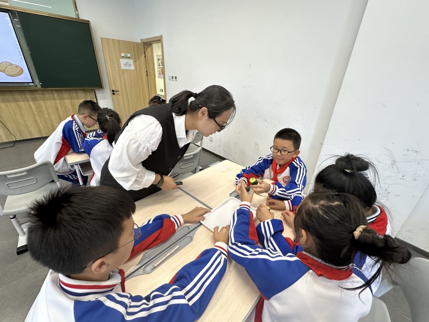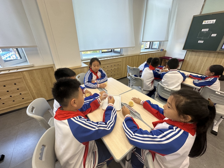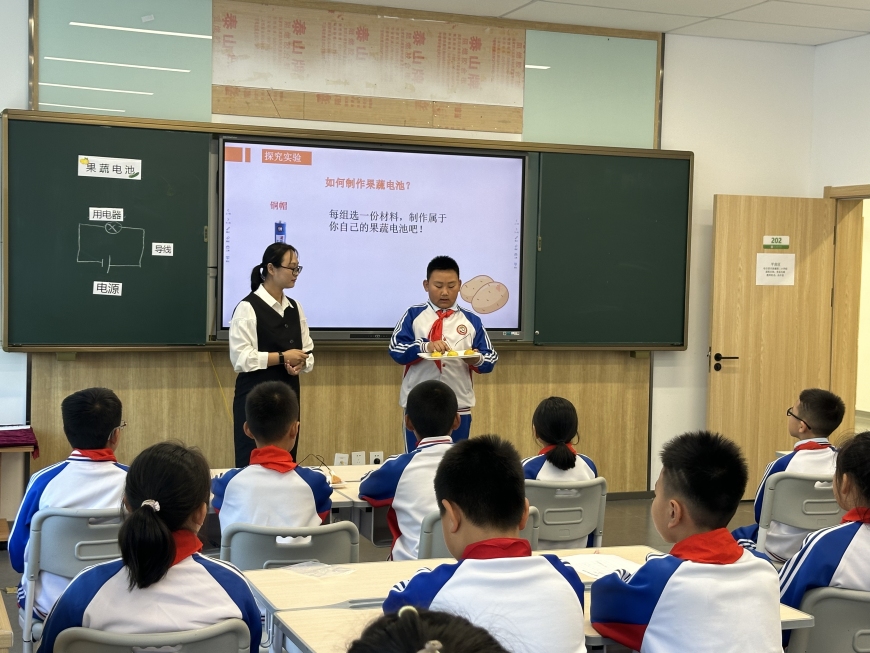 在展示活动中,孙老师巧妙地将科学知识与生活实践相结合,为学生们打开了一扇通往科学世界的大门。课堂中充分体现了以学生为中心的教学理念,通过学生们自主制作果蔬电池,现场生成需要解决的实验问题,各小组根据实验方案选取果蔬,通过实验验证到底是果蔬数量影响了小灯泡的亮度,还是果蔬种类影响了小灯泡的亮度,体现了我校对学生科学核心素养的培养。这些珍贵的瞬间,见证了孩子们的成长,也彰显了我校科学教育的成果。