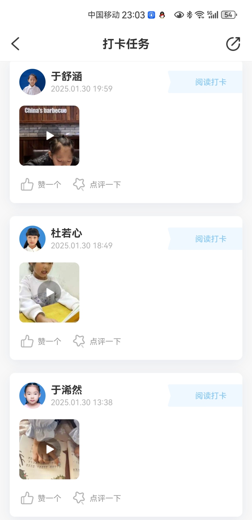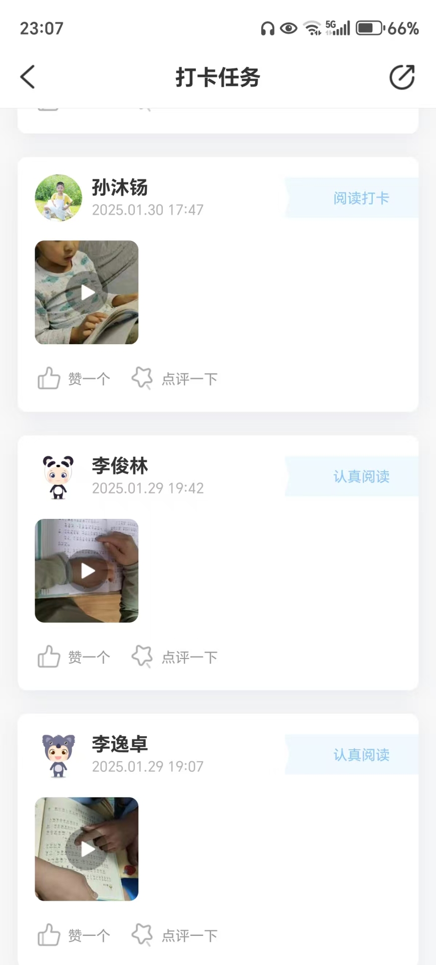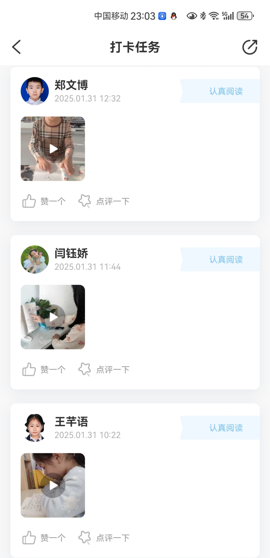 为鼓励持续阅读,学校设置每日读书打卡。同学们通过班级优化大师的阅读打卡,分享阅读照片、视频或简短心得。