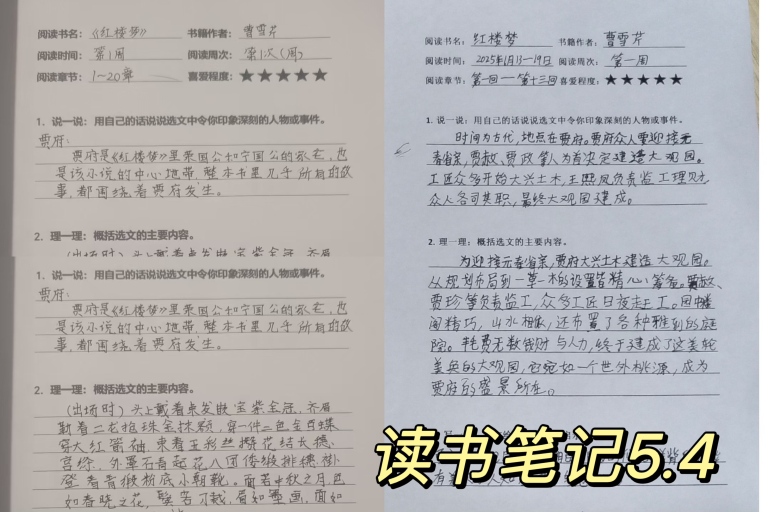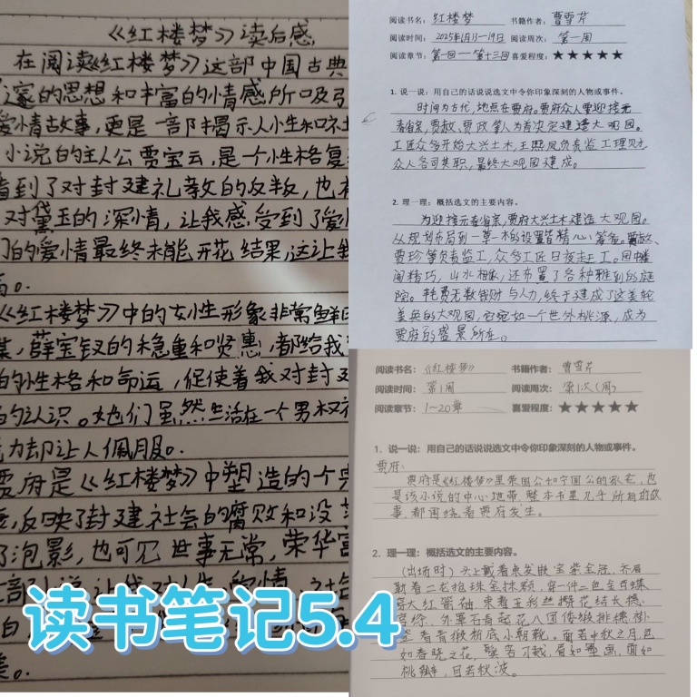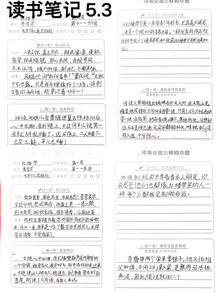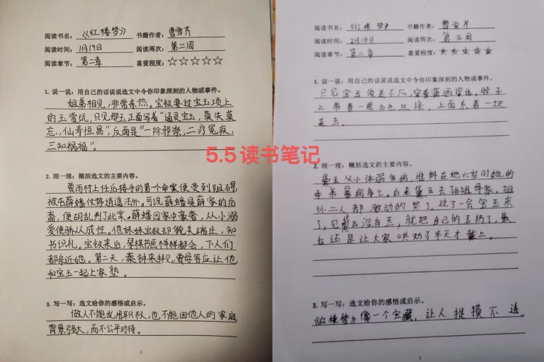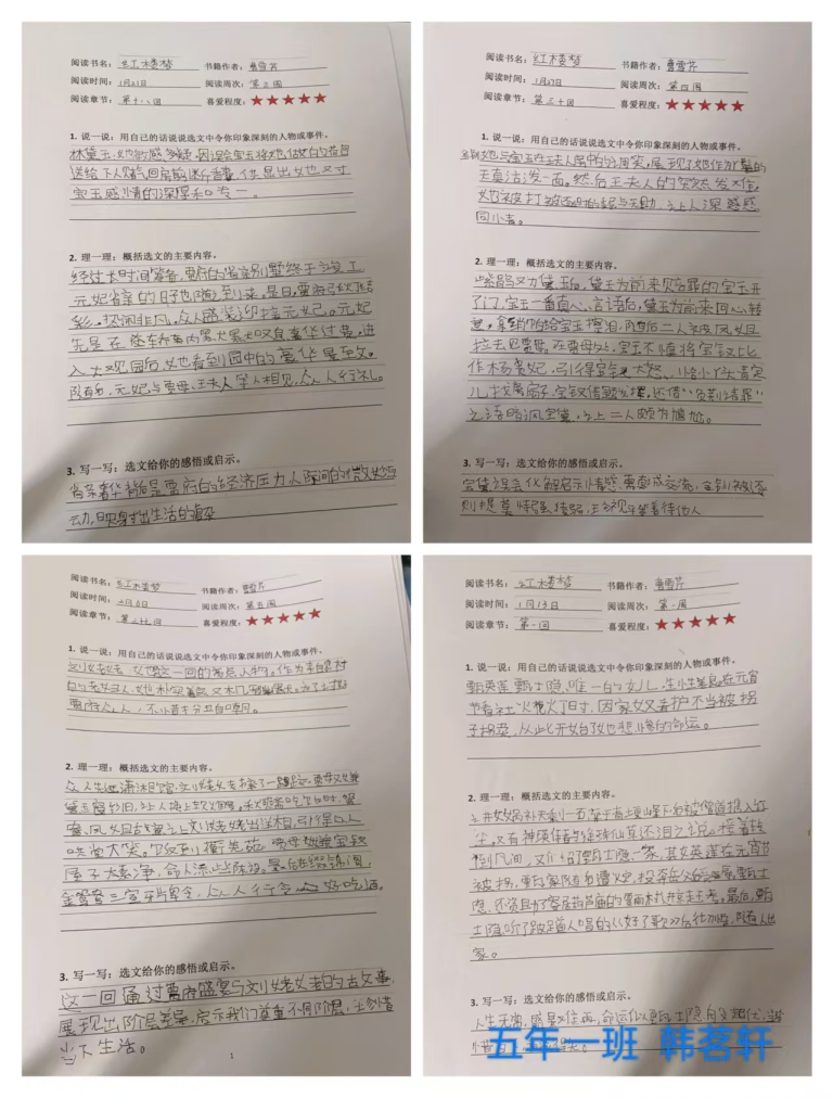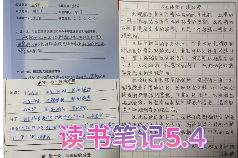 寒假伊始,五年级老师们从学校推荐的四本优秀的书目中,选择了《红楼梦》布置给各班孩子们。考虑到原著内容的复杂性,老师们推荐了适合小学生阅读的青少年版本,制定了详细的阅读计划,将整本书划分成每日阅读量,要求学生每天阅读一定章节,引导学生循序渐进研读,保证假期内完成整本书的阅读。坚持每日读书打卡,孩子们自主规划时间,用文字和照片记录成长足迹;亲子共读时光,鼓励家长与孩子共读一本书,在书香氛围中增进情感交流,培养家庭阅读习惯;教师暖心陪伴,班主任化身“阅读导师”,为孩子们的坚持点赞!