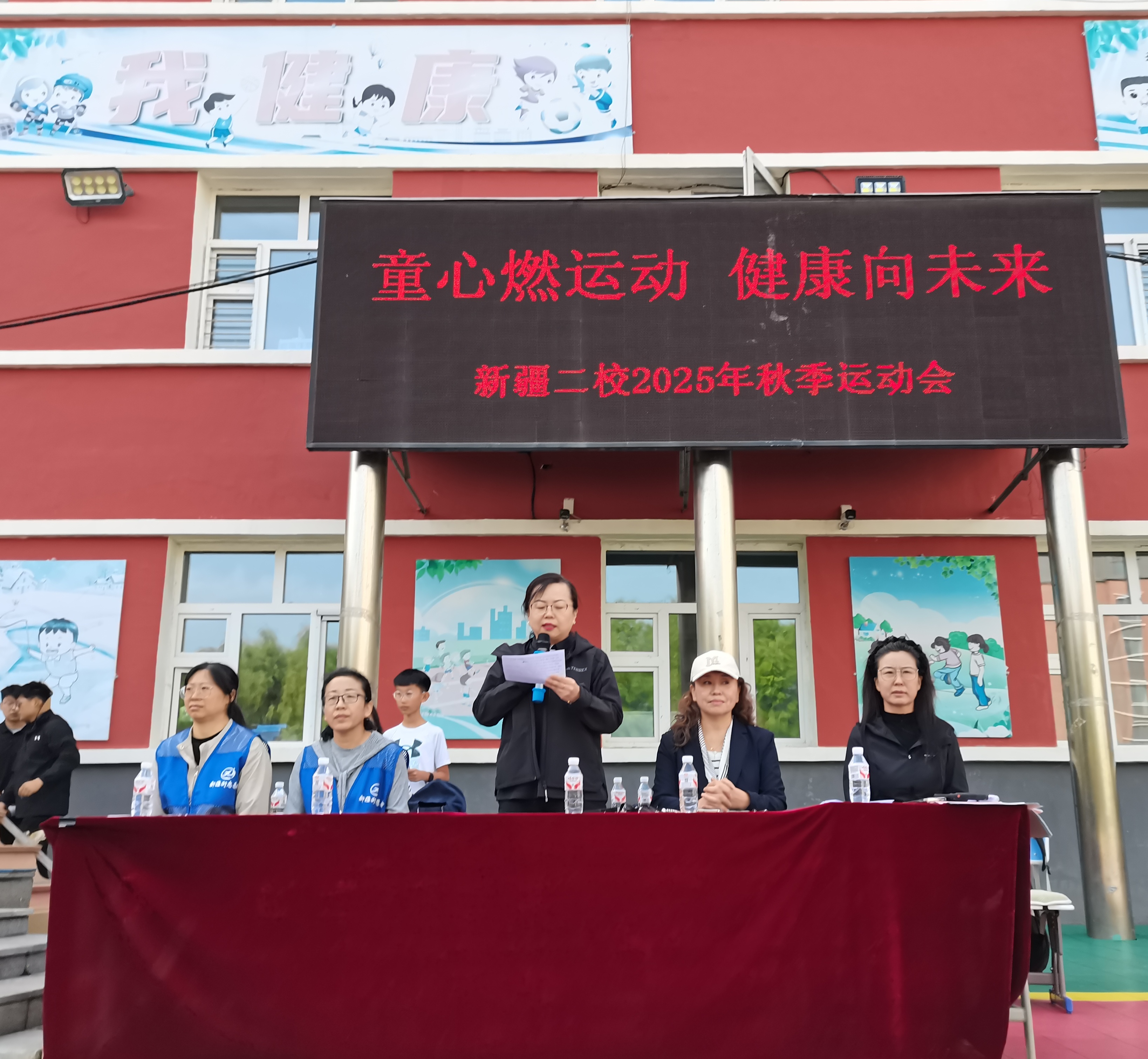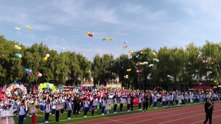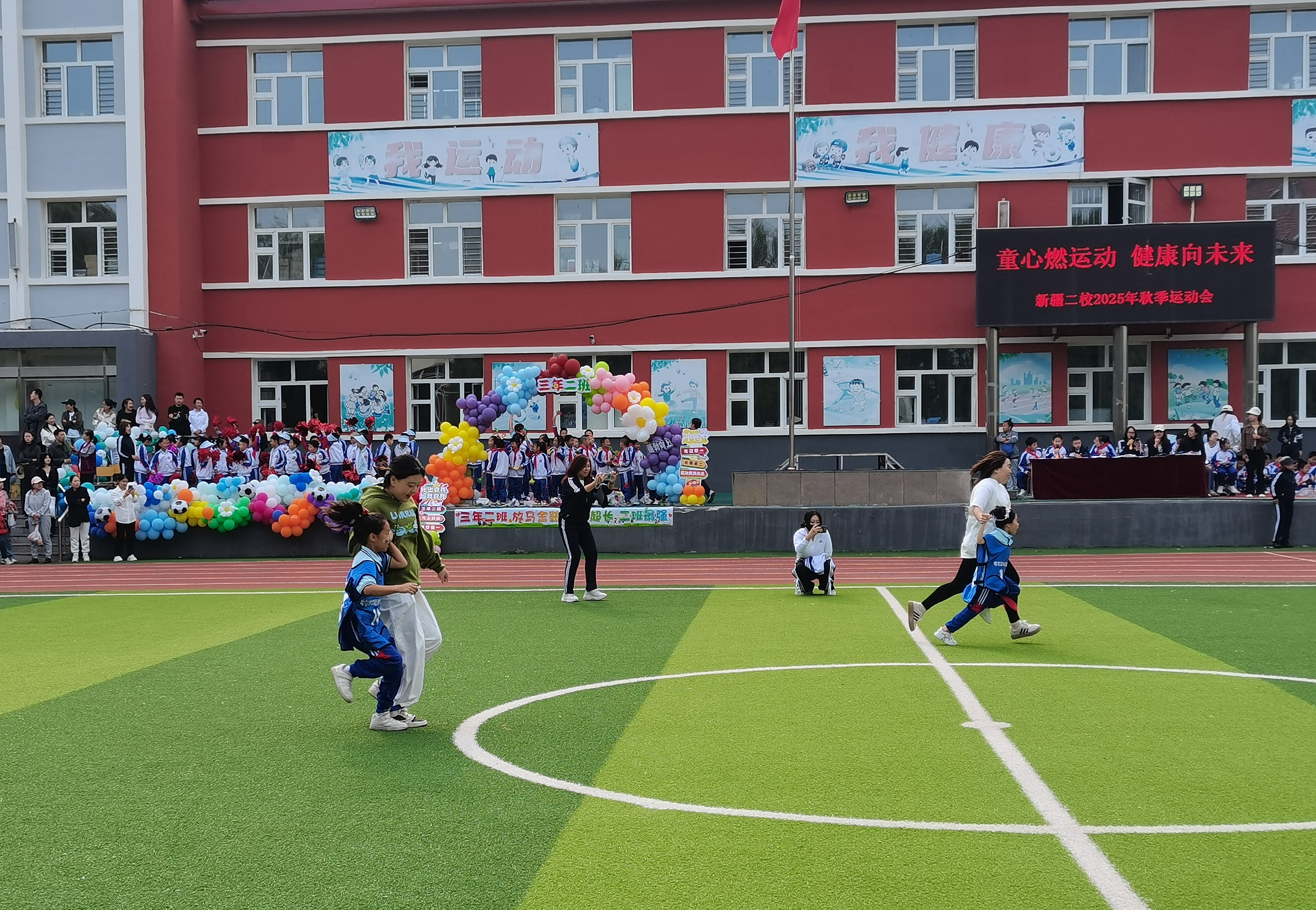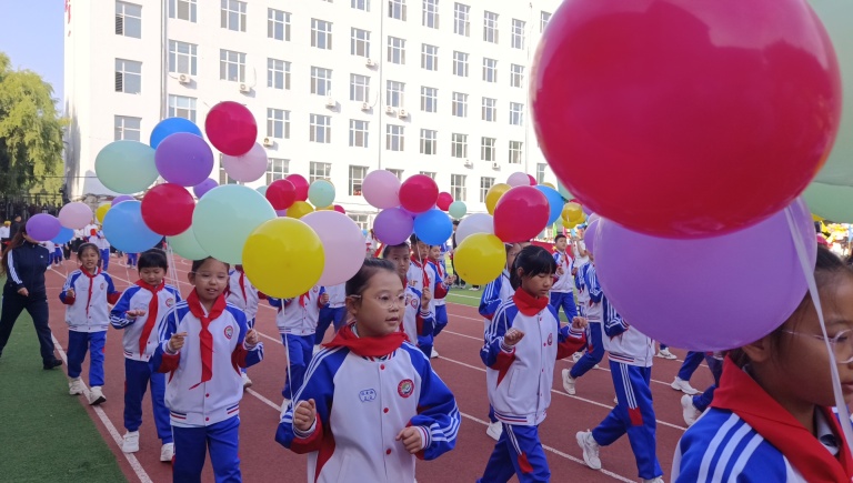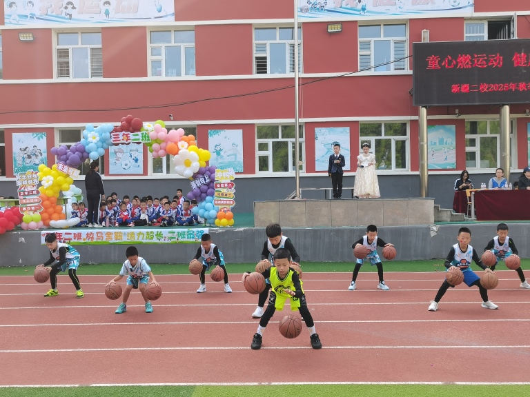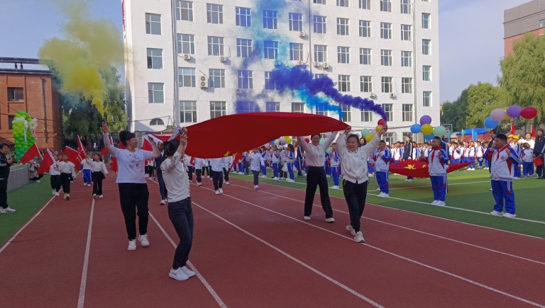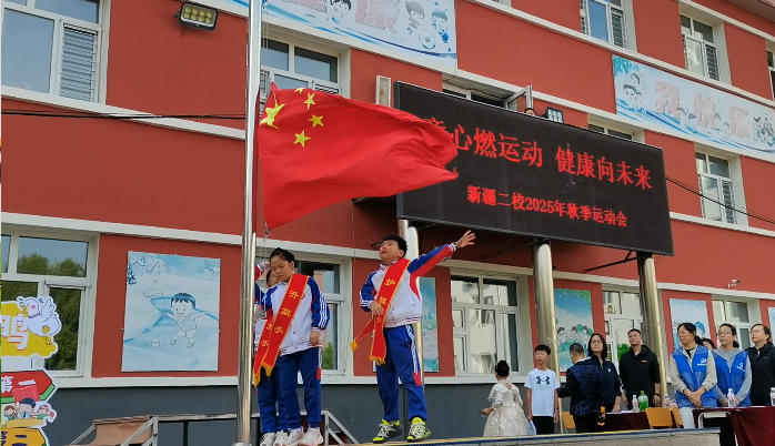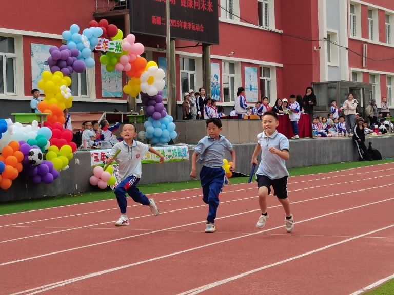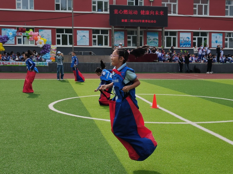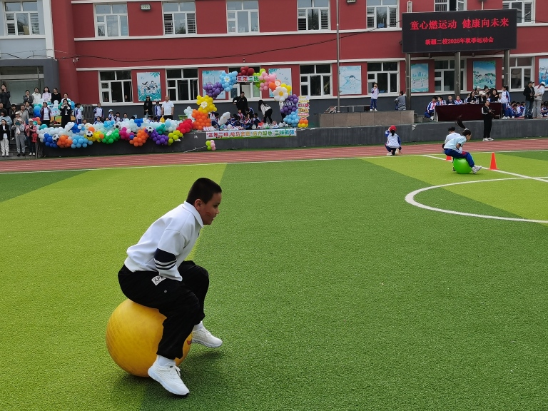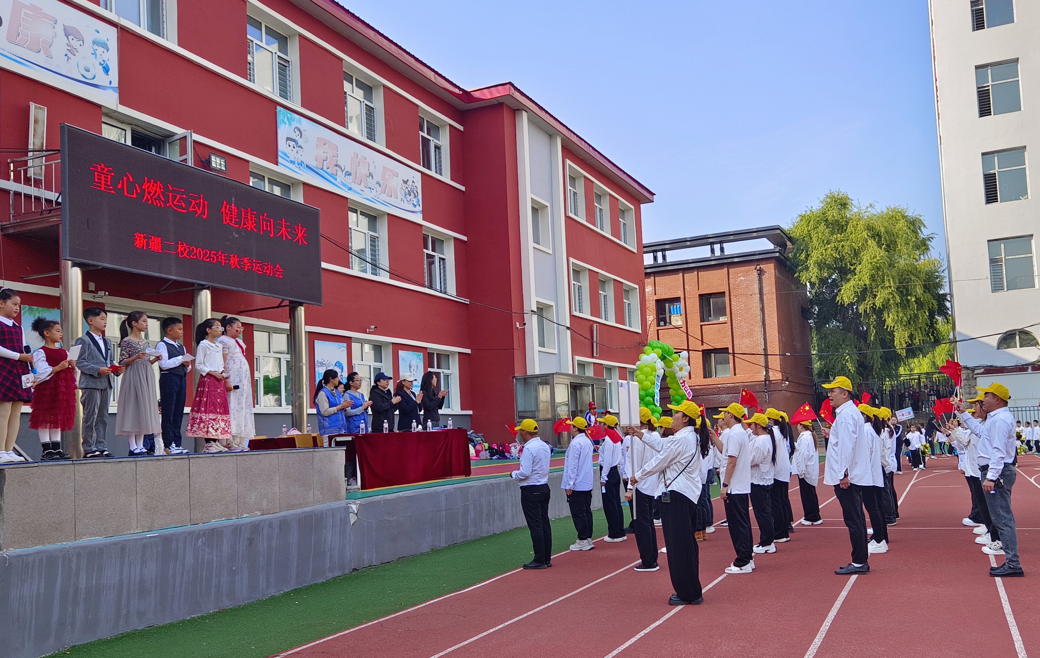副校长王海鸿发表致辞:她首先向为运动会默默付出的老师们致以诚挚慰问,感谢大家连日来筹备场地、制定规则、组织队伍的辛苦;向全力支持学校工作的家长表示衷心感谢,肯定家长们对孩子体育锻炼的重视与配合;随后结合学校在校园足球联赛、科技体育创新大赛中取得的优异成绩,鼓励运动员们以拼搏诠释体育精神;最后对运动会的安全、纪律提出要求,并宣布“新疆二校秋季运动会正式开幕!”数百只红、黄、蓝三色气球应声升空,在蓝天映衬下缓缓飞向远方,现场欢呼声与掌声交织,将运动会的开场氛围推向高潮。