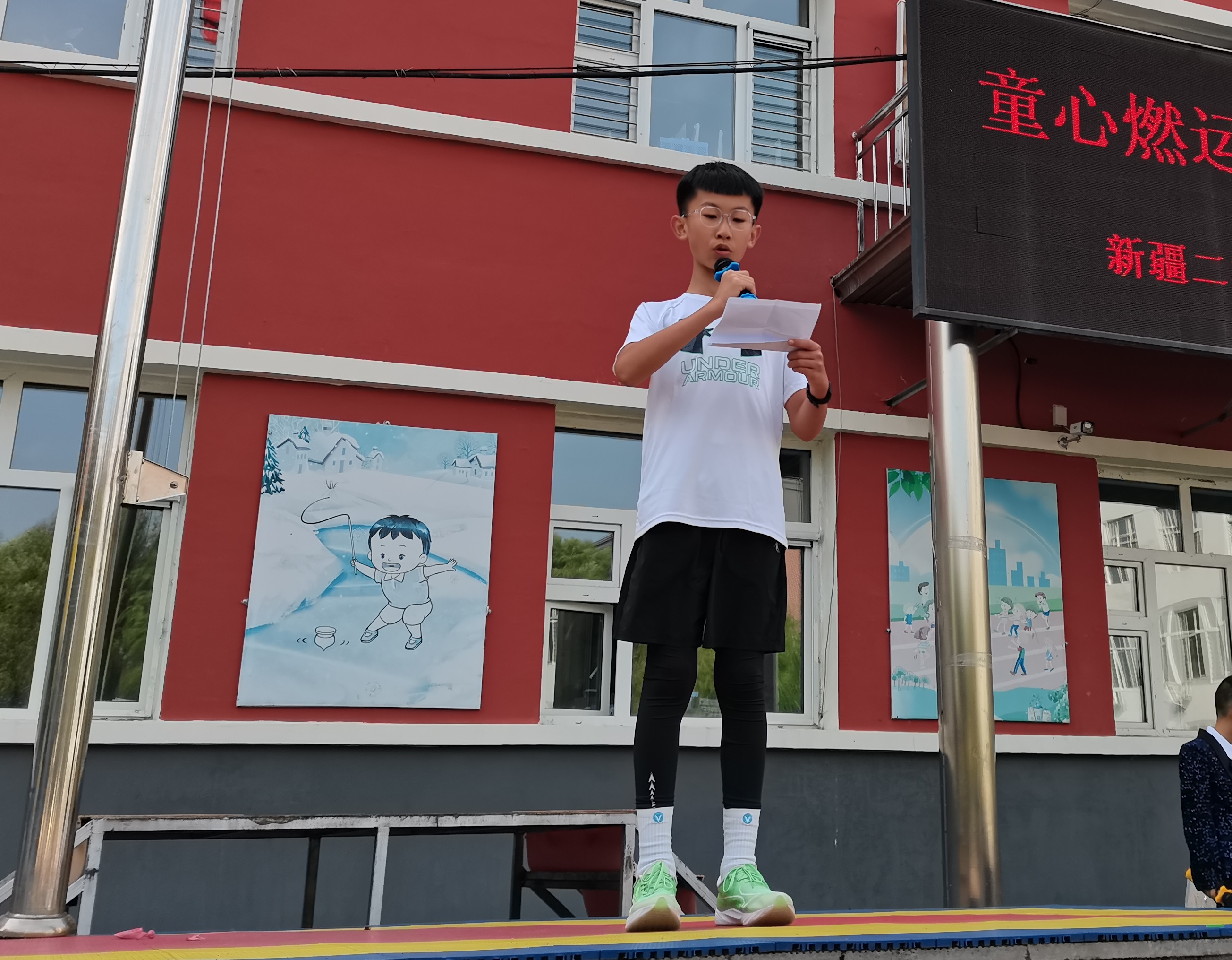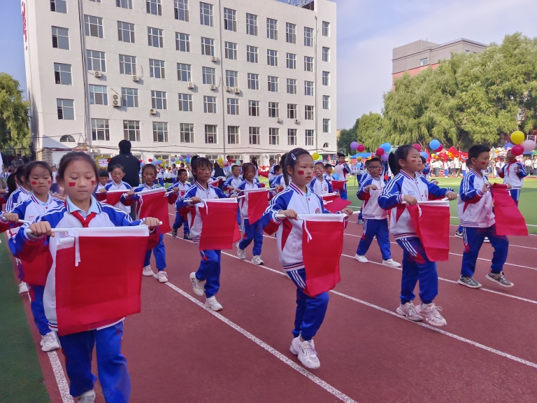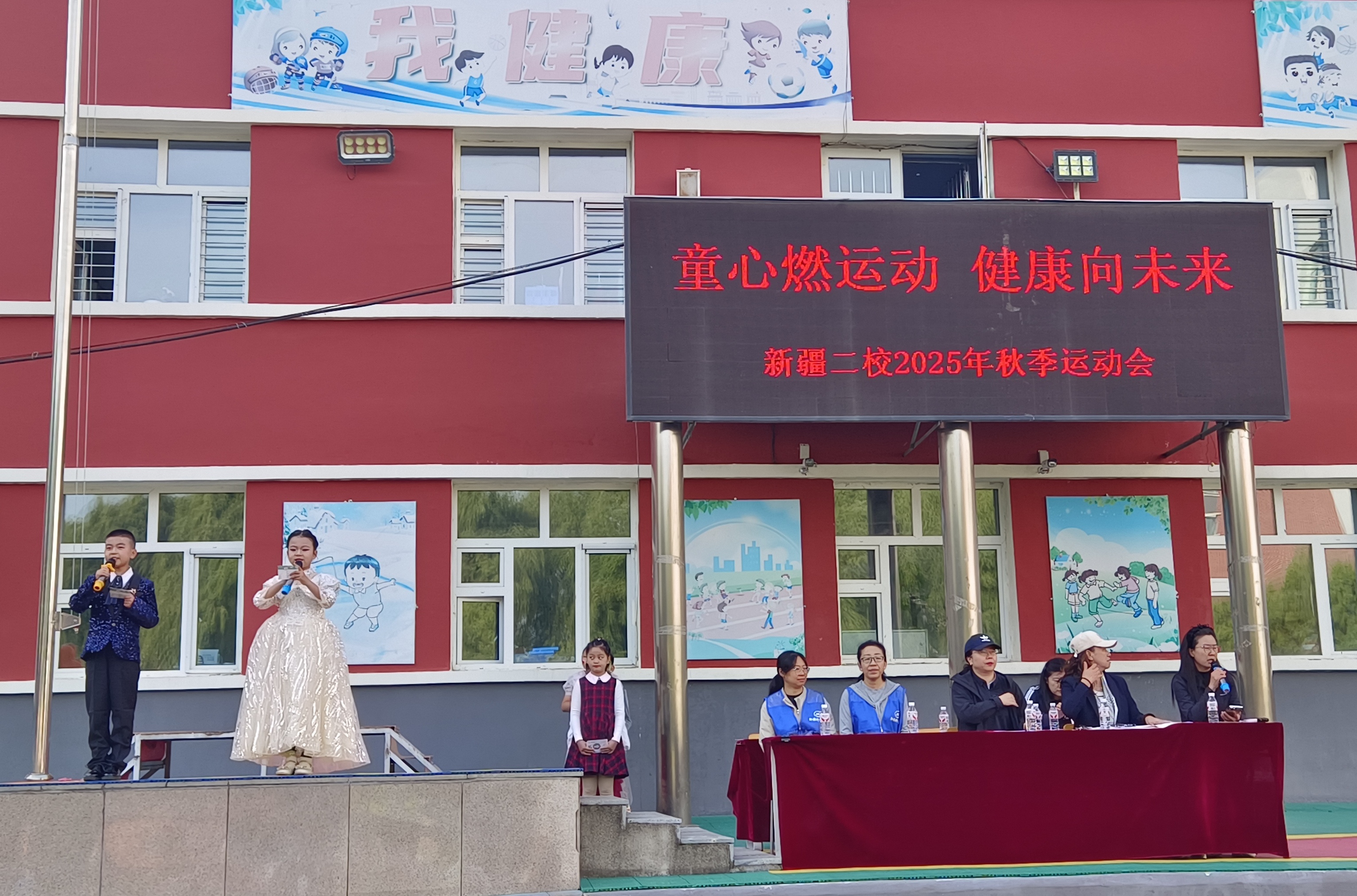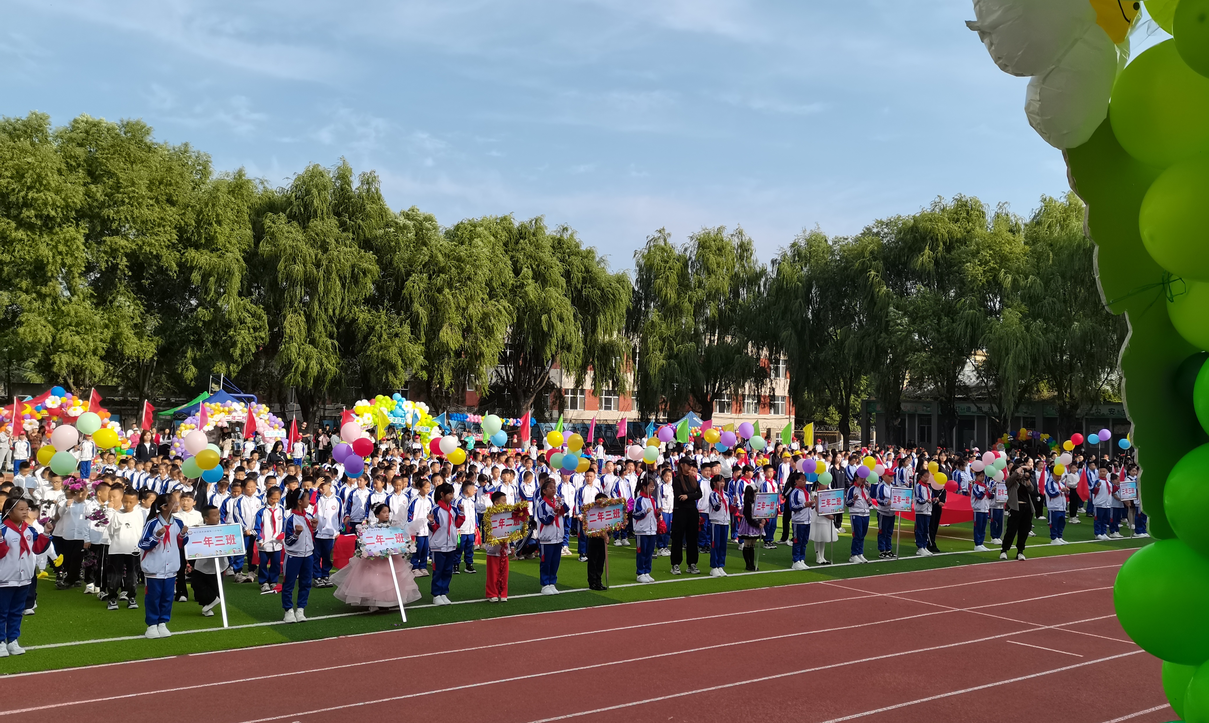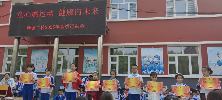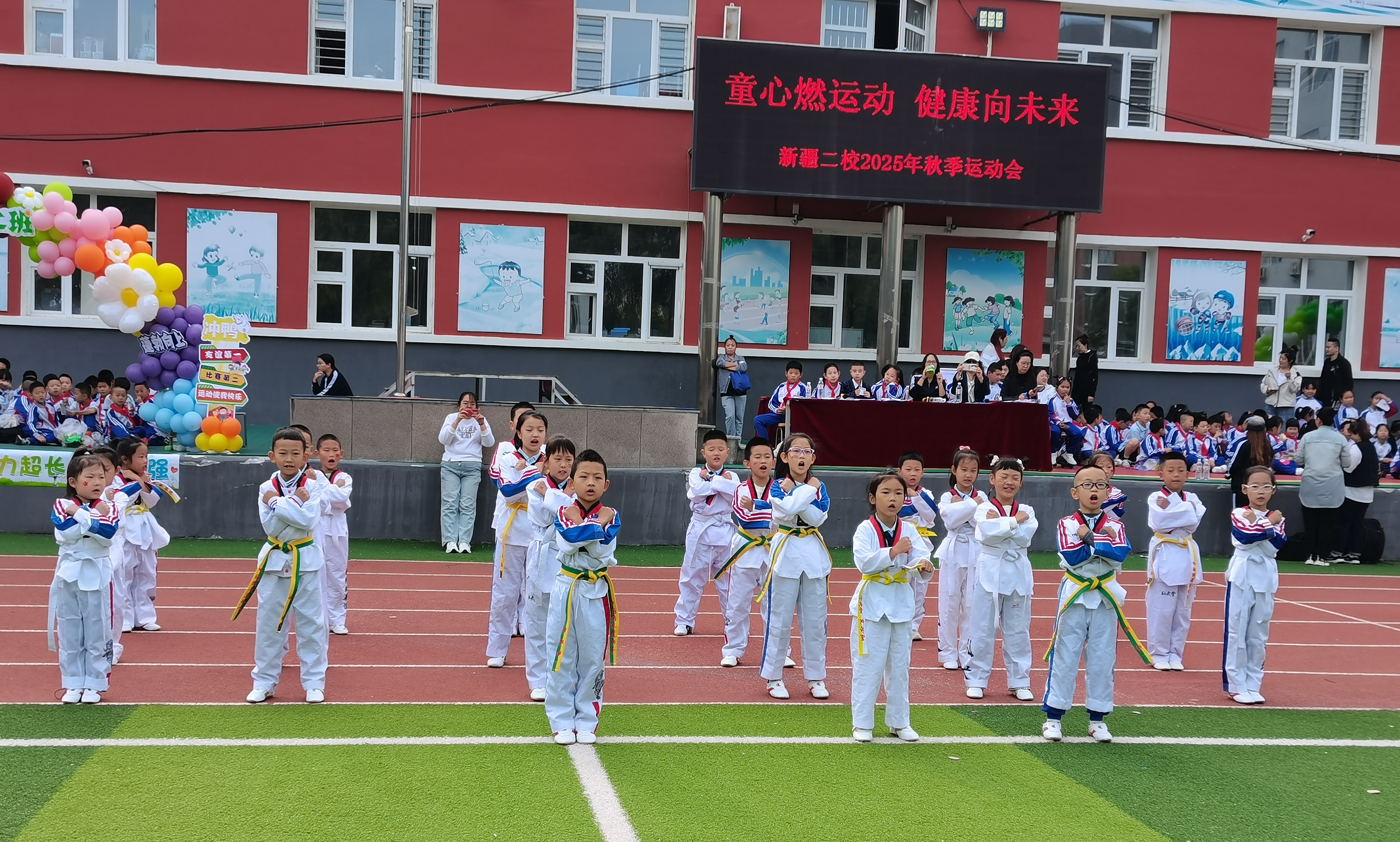 副校长王海鸿发表致辞:她首先向为运动会默默付出的老师们致以诚挚慰问,感谢大家连日来筹备场地、制定规则、组织队伍的辛苦;向全力支持学校工作的家长表示衷心感谢,肯定家长们对孩子体育锻炼的重视与配合;随后结合学校在校园足球联赛、科技体育创新大赛中取得的优异成绩,鼓励运动员们以拼搏诠释体育精神;最后对运动会的安全、纪律提出要求,并宣布“新疆二校秋季运动会正式开幕!”数百只红、黄、蓝三色气球应声升空,在蓝天映衬下缓缓飞向远方,现场欢呼声与掌声交织,将运动会的开场氛围推向高潮。