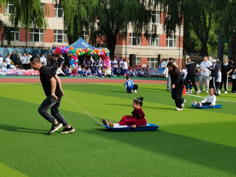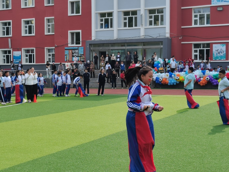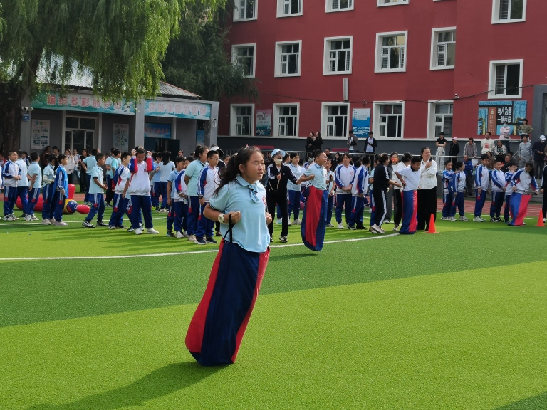 同学们钻进布袋里,双手抓住袋口,像袋鼠一样蹦蹦跳跳向前跑,有的同学节奏把控精准、一路领先,有的同学则不小心摔坐在地,却立刻爬起来继续前进,不服输的模样赢得全场掌声,全员参与的趣味项目让每个孩子都在运动中收获了纯粹的快乐。