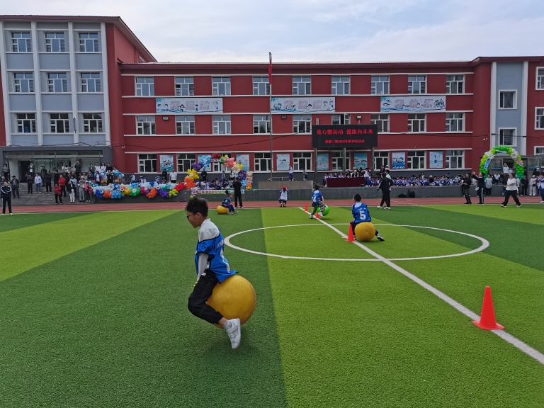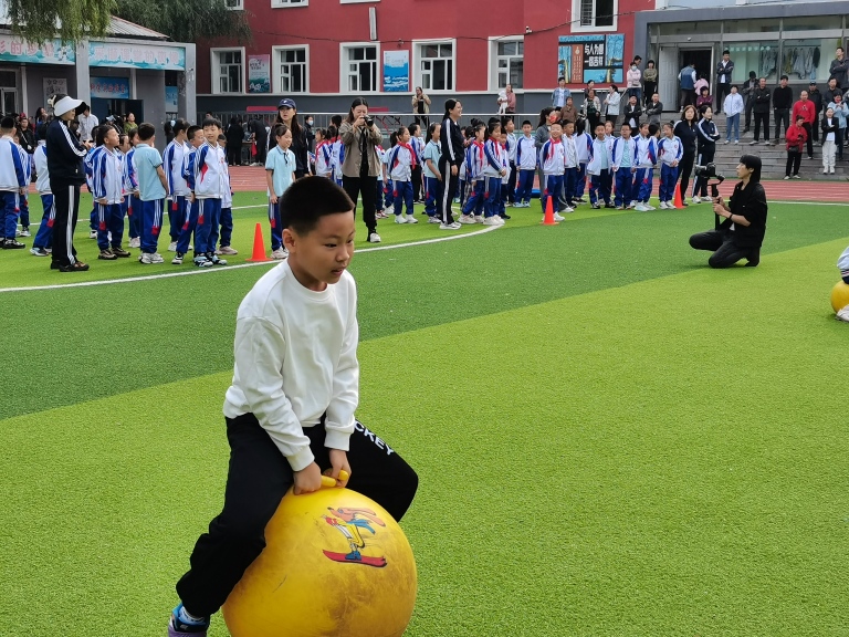 同学们双腿紧紧夹住五彩的弹力球,身体微微前倾,双臂张开保持平衡,像一群笨拙又可爱的小袋鼠。有的同学找到了节奏,一蹦一跳地往前冲,引得场边加油声此起彼伏;有的刚一发力就重心不稳,和弹力球一起滚成一团,爬起来吐吐舌头,又笑着继续往前蹦。整个赛场充满了欢声笑语,每个人脸上都洋溢着最灿烂的笑容。