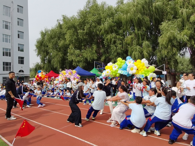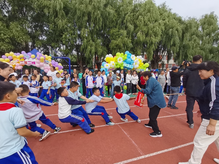 同学们紧握绳索、双脚蹬地,身体后倾形成整齐的“力阵”,班主任在一旁挥舞着旗帜呐喊助威,“一二、一二”的口号声震耳欲聋,每一次绳索的轻微移动,都牵动着全场师生的心。以最佳状态展示运动竞技风采。