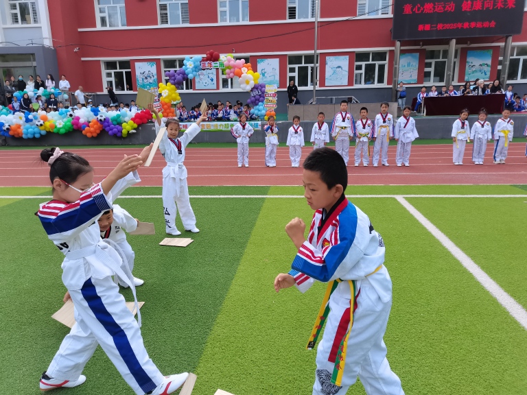 跆拳道社团的同学们身着洁白的道服,迈着整齐的步伐登场。随着激昂的音乐,他们动作刚劲有力,踢腿、出拳行云流水,整齐划一的品势表演尽显力量与气势;更有社员带来高难度的击破动作,一记利落的横踢将木板劈成两半,利落的动作与坚定的眼神,让现场师生感受到跆拳道“礼始礼终”的精神与少年的蓬勃朝气,精彩的表演为运动会增添了别样的热血色彩。