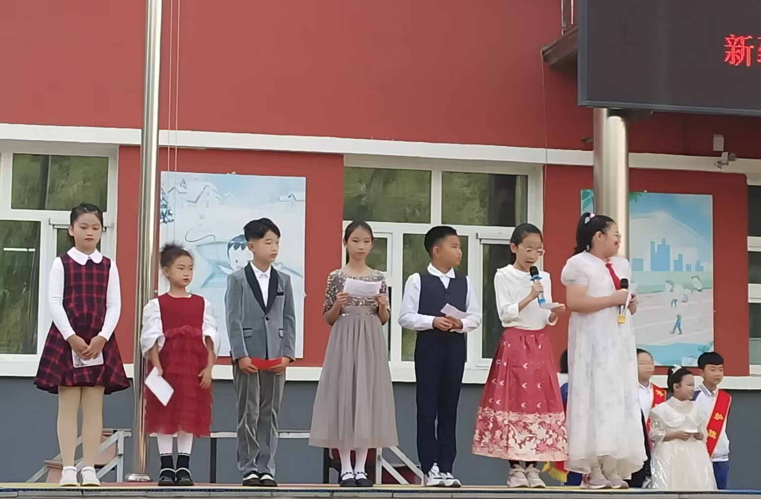 同学们自发登台演唱环节更添惊喜。没有华丽的伴奏,只有清澈的嗓音和真挚的情感。孩子们先后演唱了《童心向党》《童话镇》等励志又欢快的歌曲。呐喊声、掌声此起彼伏,不仅为紧张的竞技增添了轻松的色彩,更展现了新时代少年自信开朗、勇于表达的精神风貌,成为本届运动会上一道亮丽的风景线。