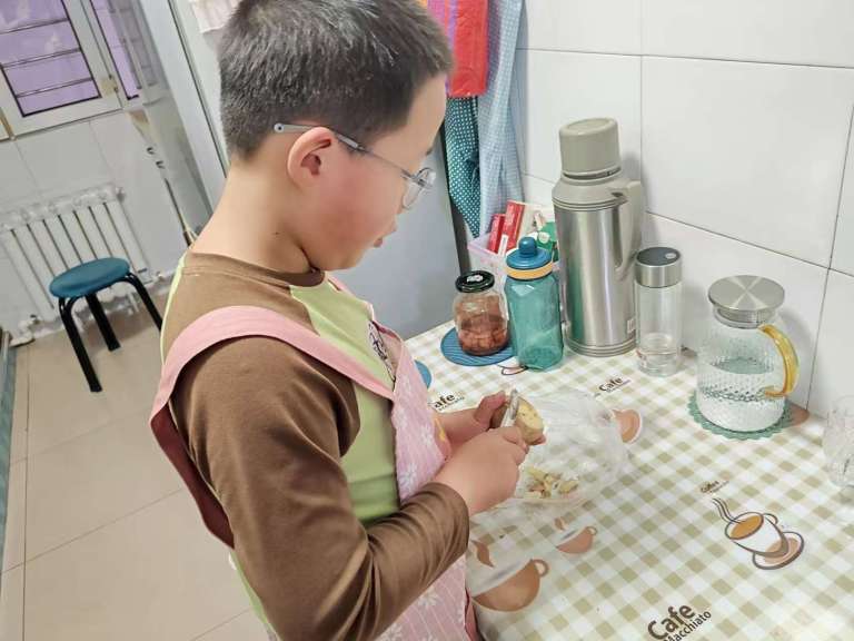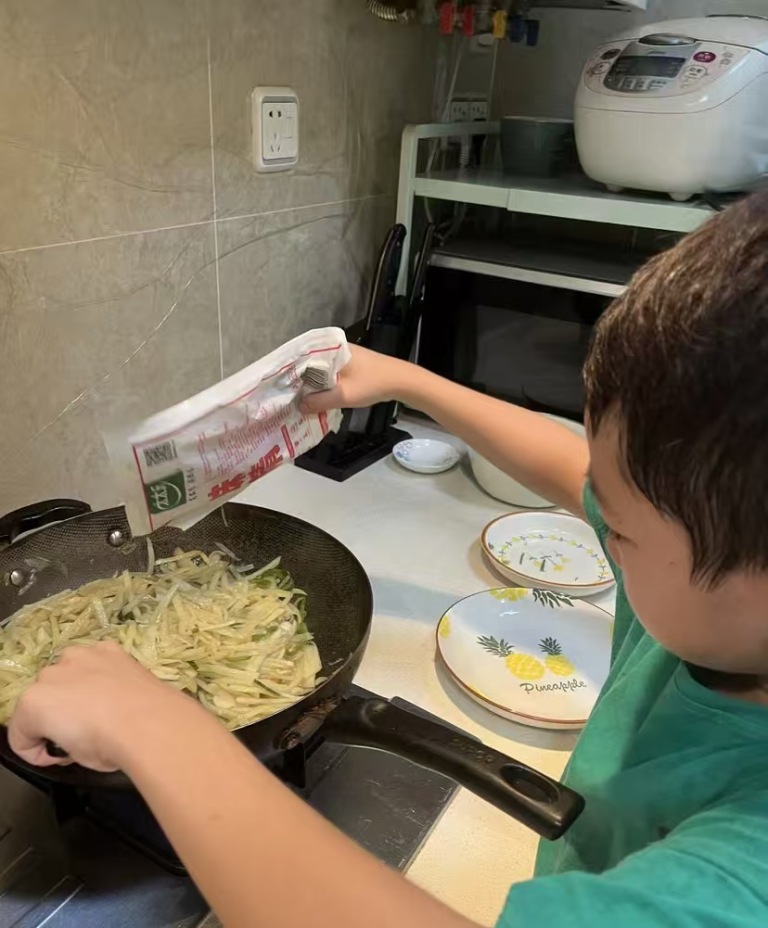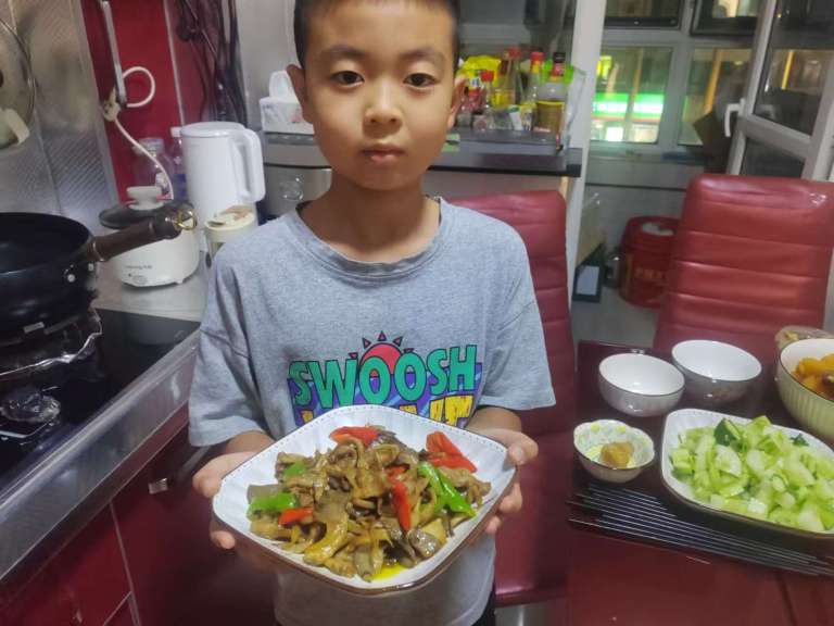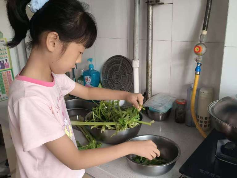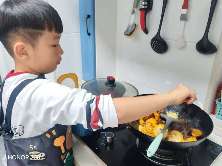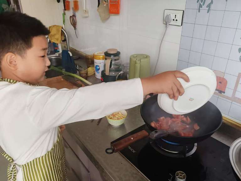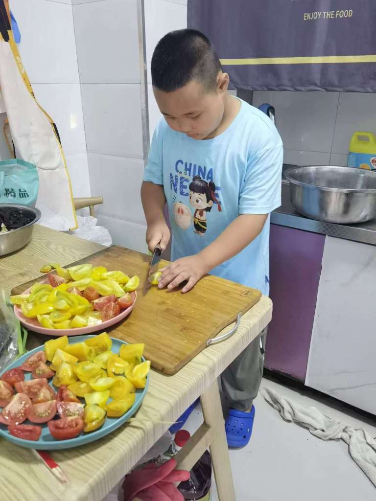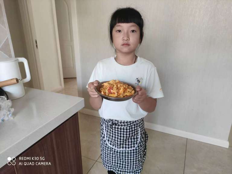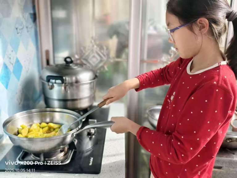 当国庆的欢腾遇上中秋的团圆,家国同庆的喜悦便愈发浓郁。四年级的同学们接下了“厨神小当家”的挑战——我为中秋添道菜。系上围裙,拿起锅铲,从洗菜、切配到烹饪、摆盘,虽不免手忙脚乱,但诚意满满。一盘西红柿炒蛋,一碗美味的糖醋排骨,一盘精致的月饼拼盘……当自己的“作品”被端上团圆饭桌,赢得家人的连连称赞时,那份自豪与幸福无以言表。这不仅仅是一道菜,更是孝心与感恩的传递,是中华“家文化”的温暖传承。