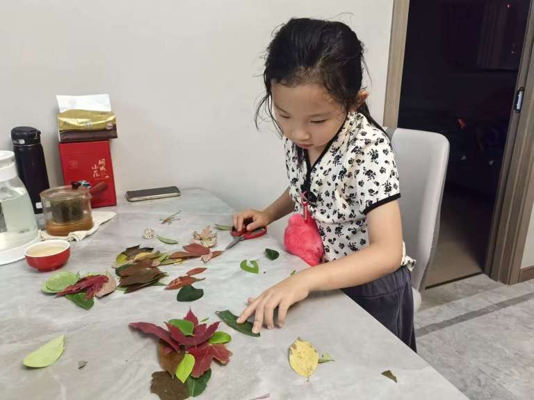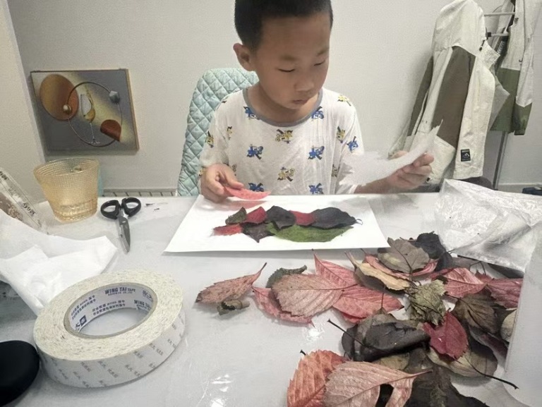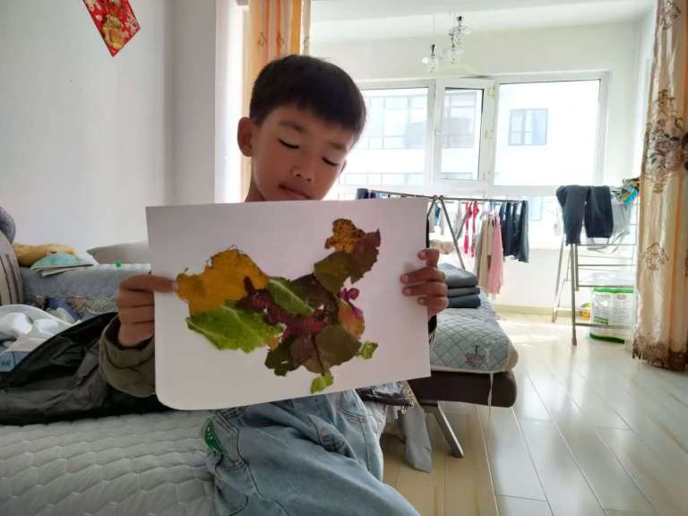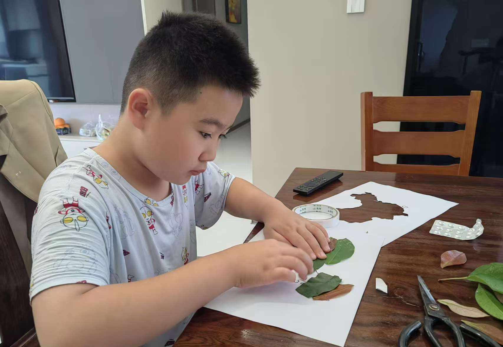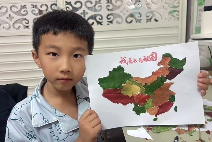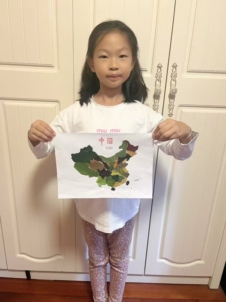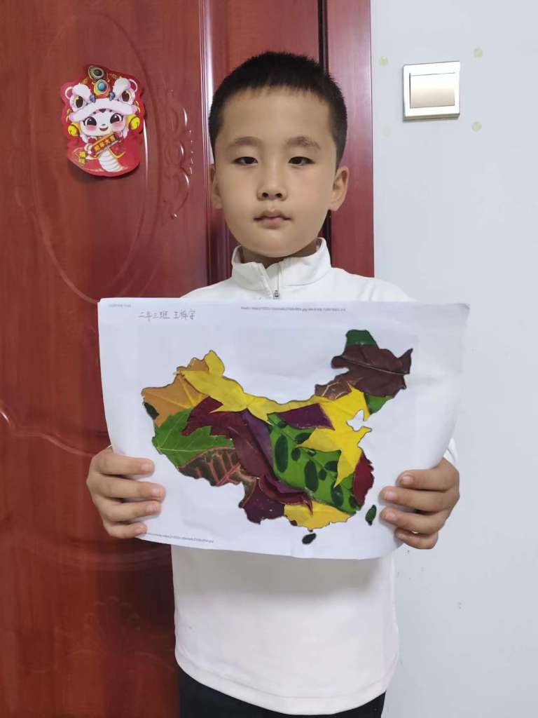 一叶知秋,一图寄情。二年级的同学们化身“自然艺术家”,走进秋的怀抱,收集形态各异、色彩斑斓的落叶。他们以童真的视角和灵巧的双手,将一片片普通的树叶,拼贴成雄鸡报晓般的中国地图。山河轮廓,用叶脉勾勒;爱国热忱,以秋色渲染。这不仅是巧思与美的创造,更是一堂生动的国家版图课。方寸之间,尽显对祖国壮丽山河的无限热爱与深情守护。