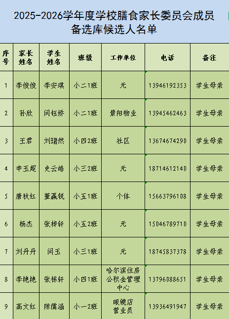 2025——2026学年度膳食监督家长委员备选库候选人会名单