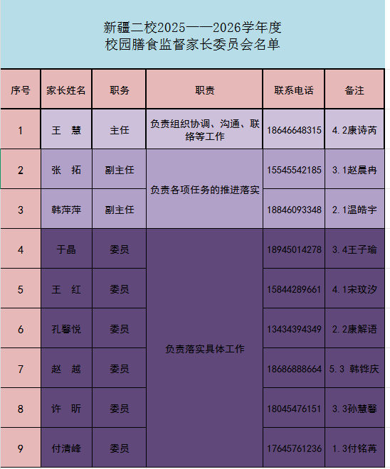 首届膳食监督家长委员会采用层级推选的形式:班级推荐→学校审核,形成备选库与正式名单。每学年调整一次,可连任,缺位时通过家长群发布通知,从新人学年增补,中途因故退出,从备选库增补。
