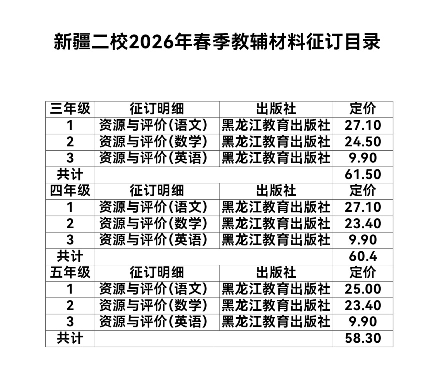 为全面落实国家“双减”政策精神,进一步规范办学行为,我校根据相关工作部署,推动教辅材料征订管理各项政策规定落地落细,进一步建立健全切实管用的长效机制,确保教辅材料征订工作规范、有序、透明,切实减轻学生过重课业负担和家长经济负担,营造风清气正的育人环境,持续提升教育教学质量,办好人民满意的教育,现公示2025-2026下学期教辅材料明细。