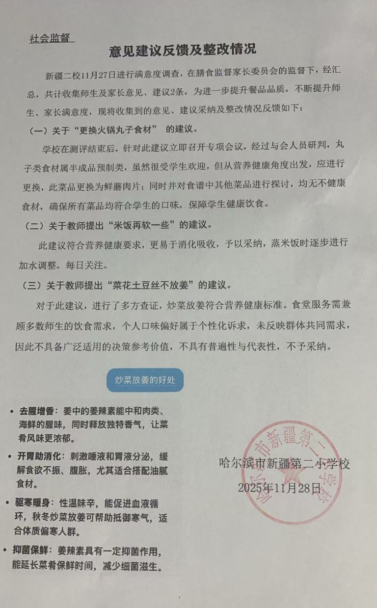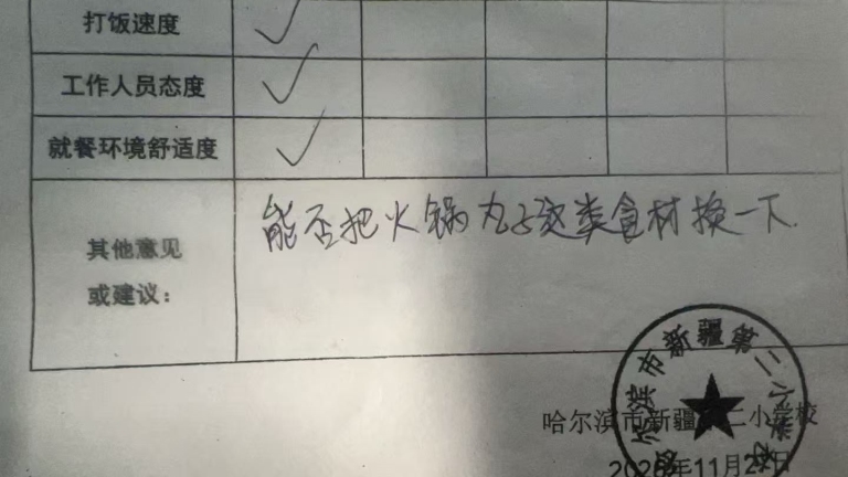 (一)关于“更换火锅丸子食材” 的建议。学校在测评结束后,针对此建议立即召开专项会议,经过与会人员研判,丸子类食材属半成品预制类,虽然很受学生欢迎,但从营养健康角度出发,应进行更换,此菜品更换为鲜蘑肉片;同时并对食谱中其他菜品进行探讨,均无不健康食材,确保所有菜品均符合学生的口味,保障学生健康饮食。