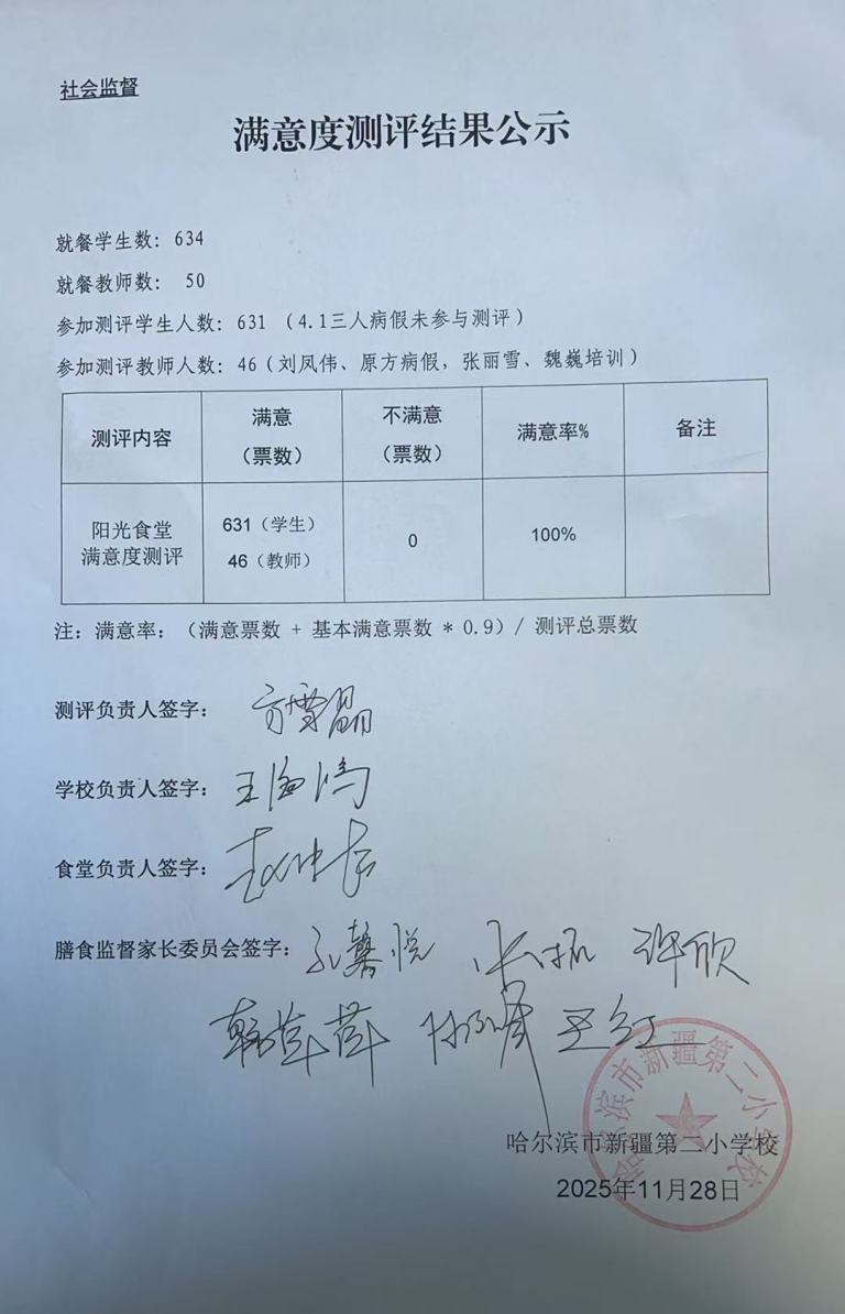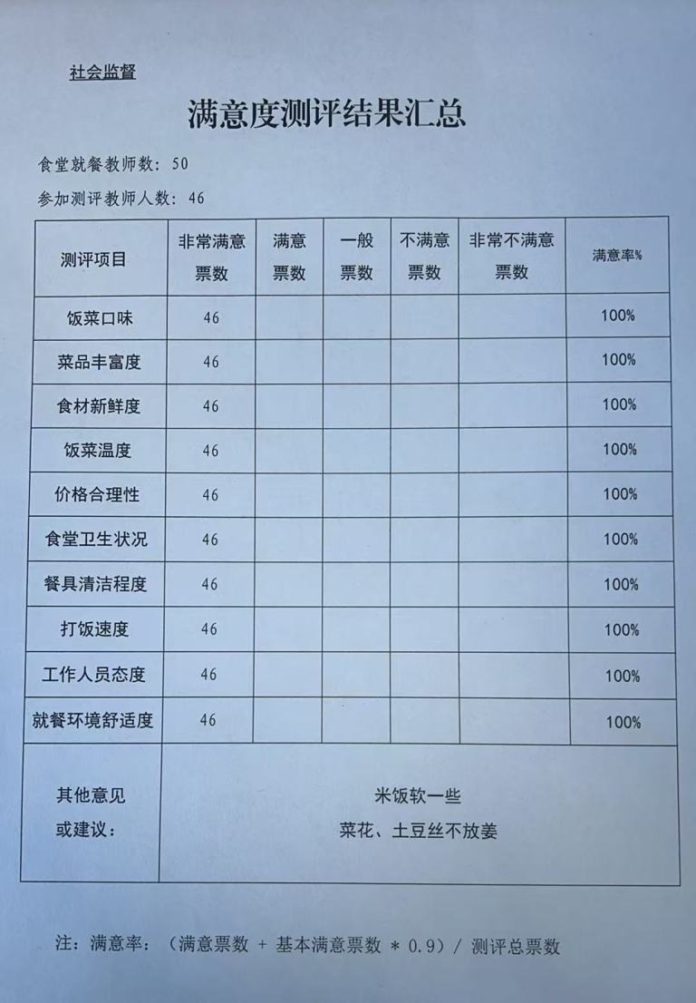 为全面了解学校阳光食堂的运营情况,切实保障学生的就餐体验与权益,学校于2025年11月27日组织开展了阳光食堂满意度测评工作,现将具体结果公示如下: