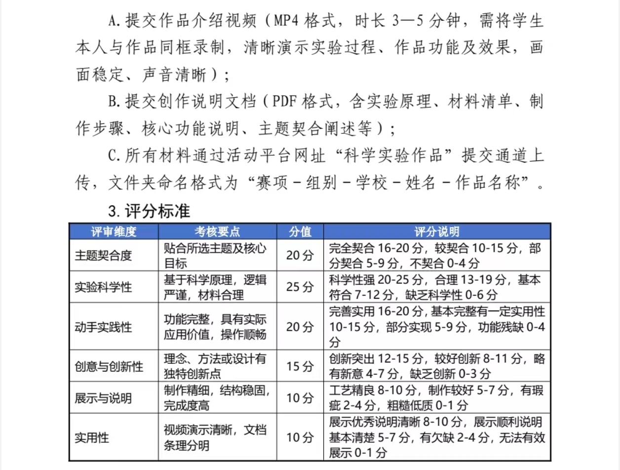 请同学们根据要求录制科学制作及展示的完整步骤,积极创作属于你的精彩科创作品。